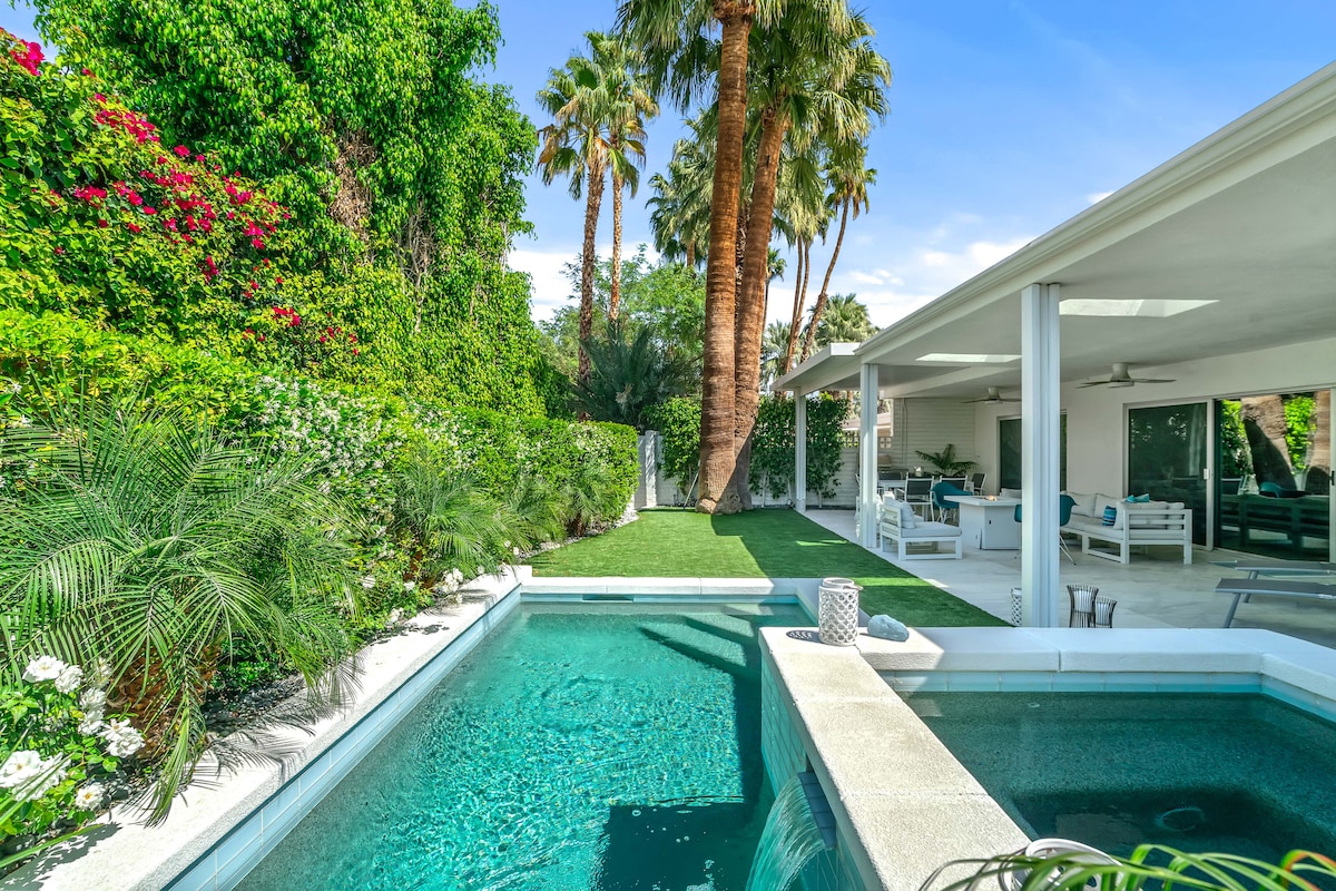 Remodeled, modern, walking distance to El Paseo! Our home is the perfect place to recharge and enjoy everything the desert has to offer! Featuring 2 bedrooms, one with 2 XL twin beds that can convert to a Cal King instead! 2 baths, high-speed internet, Free Level 2 EV Charging, pool and jacuzzi, fully equipped kitchen, new appliances, fire pit and loads of space for indoor/outdoor enjoyment. Located within walking distance of El Paseo, exquisite dining, shopping and even The Living Desert zoo.😃