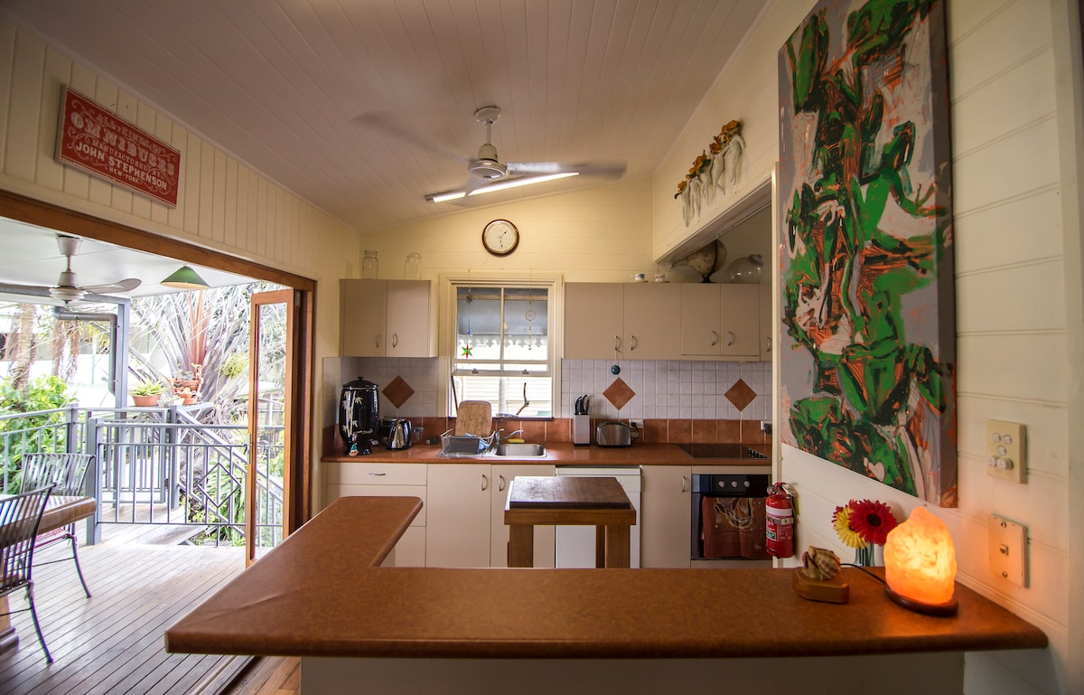Clásico Queenslander con carácter de ciudad interior. Totalmente amueblado con 2 camas tamaño queen y 2 camas individuales. A 100 metros a pie de la estación central de tren de Cairns. A poca distancia a pie de la ciudad, el puerto, restaurantes y tiendas. Cocina totalmente equipada. Jardín tropical con cactus y suculentas. Kevin vive abajo en una unidad separada. La lavandería está abajo y se comparte con Kevin, pero está disponible y accesible en todo momento.