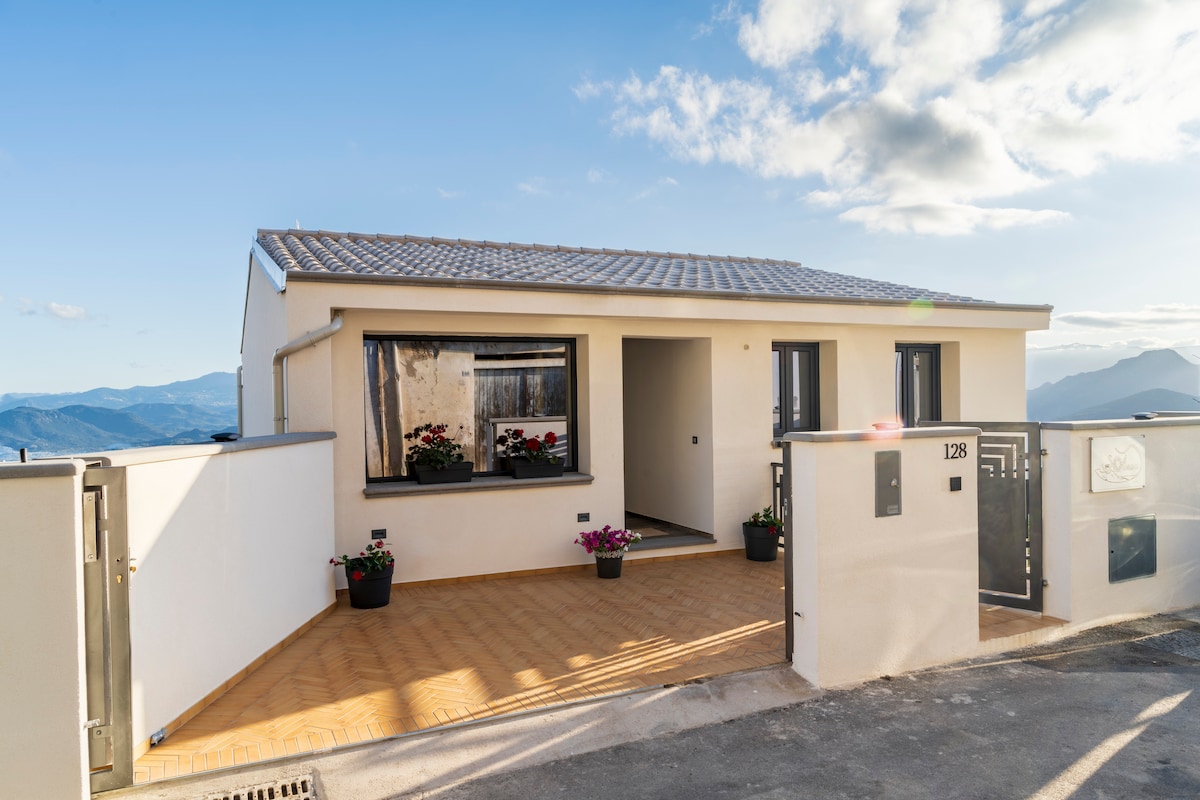 Appartamento da 90mq che occupa per intero il primo piano della casa, con altri appartamenti nei piani inferiori a questo. Appartamento con 3 camere da letto per 5 persone, con ampia living room luminosa . Terrazza panoramica con barbecue in pietra .