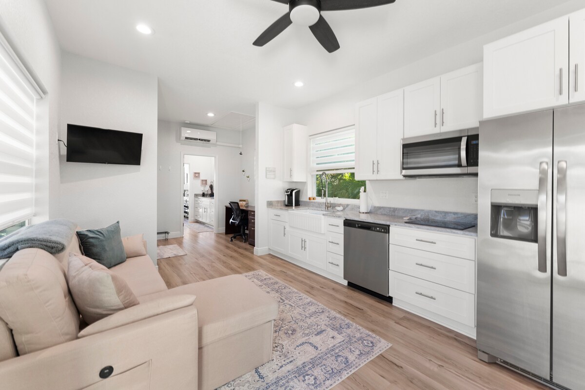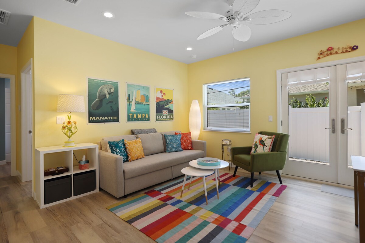 Steps to Main Street ! Experience modern coastal luxury in this stylish, spacious upstairs 2-bedroom cottage. Professionally designed and fully stocked. Walk to Main Street Dunedin or take the short stroll to stunning sunsets at the waterfront. Quick drive to award winning beaches--Honeymoon Island & Clearwater Beach. Walk to restaurants, shops, & breweries. Pet-friendly w/ 2 king beds, a sleeper sectional, & lovely treetop views. Treat yourself today and escape to the Barefoot Parrot Cottages.