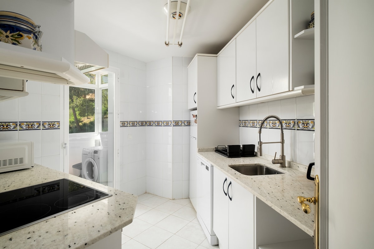 Cozy, bright, entirely renovated quality flat on the front line with sea views from the sunny and large balcony, both rooms and the bathroom. Features his and her shower, full kitchen, 2 tennis courts, 2 swimming pools (1 for children) large gardens, private beach area, free beach beds and private parking. We have a sandy beach with Blue Flag status and direct access to the sea boardwalk. Near Marbella and La Cala with 75+ restaurants and many shops walking distance. Strict cleaning protocols.