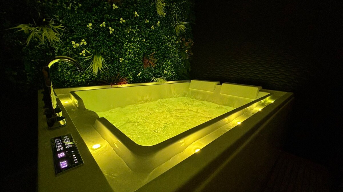 Una suite de 30 m2, dedicada a la relajación. Nuestra casa de campo consta de una entrada que da acceso a los aseos Una zona de cocina equipada (nevera, placa de inducción portátil, cafetera, hervidor, tostadora, microondas, vajilla) Una cama «queen size» de 160 cm × 200 cm Una pantalla plana de 138 cm conectada Una chimenea eléctrica con llamas, una acogedora sala de estar Un cuarto de baño vegetal con su lavabo de piedra y su gran ducha tropical con luminoterapia, un balneario de 2 plazas, con radio y bluetooth integrado.