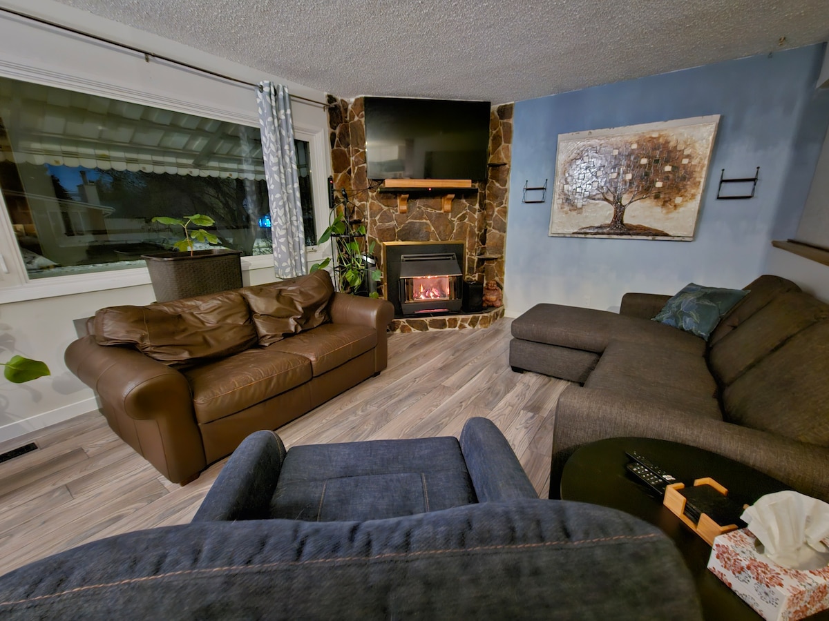 Una cálida y espaciosa suite en el sótano (con acceso privado), situada justo al lado de la autopista 1, que te da muy fácil acceso a Banff y a un sinfín de opciones de esquí y recreación al aire libre, ¡pero aún así está a solo 15 minutos del centro de la ciudad! 2 dormitorios elegantes y acogedores, área común grande y climatizada con un cómodo sillón reclinable/sofá cama/chaise seccional, baño, cocina totalmente equipada y una lavandería separada en el cuarto de la mano, ¡donde puedes guardar el equipo de esquí! ¡Perfecta para familias y para todos los que aman la diversión invernal!