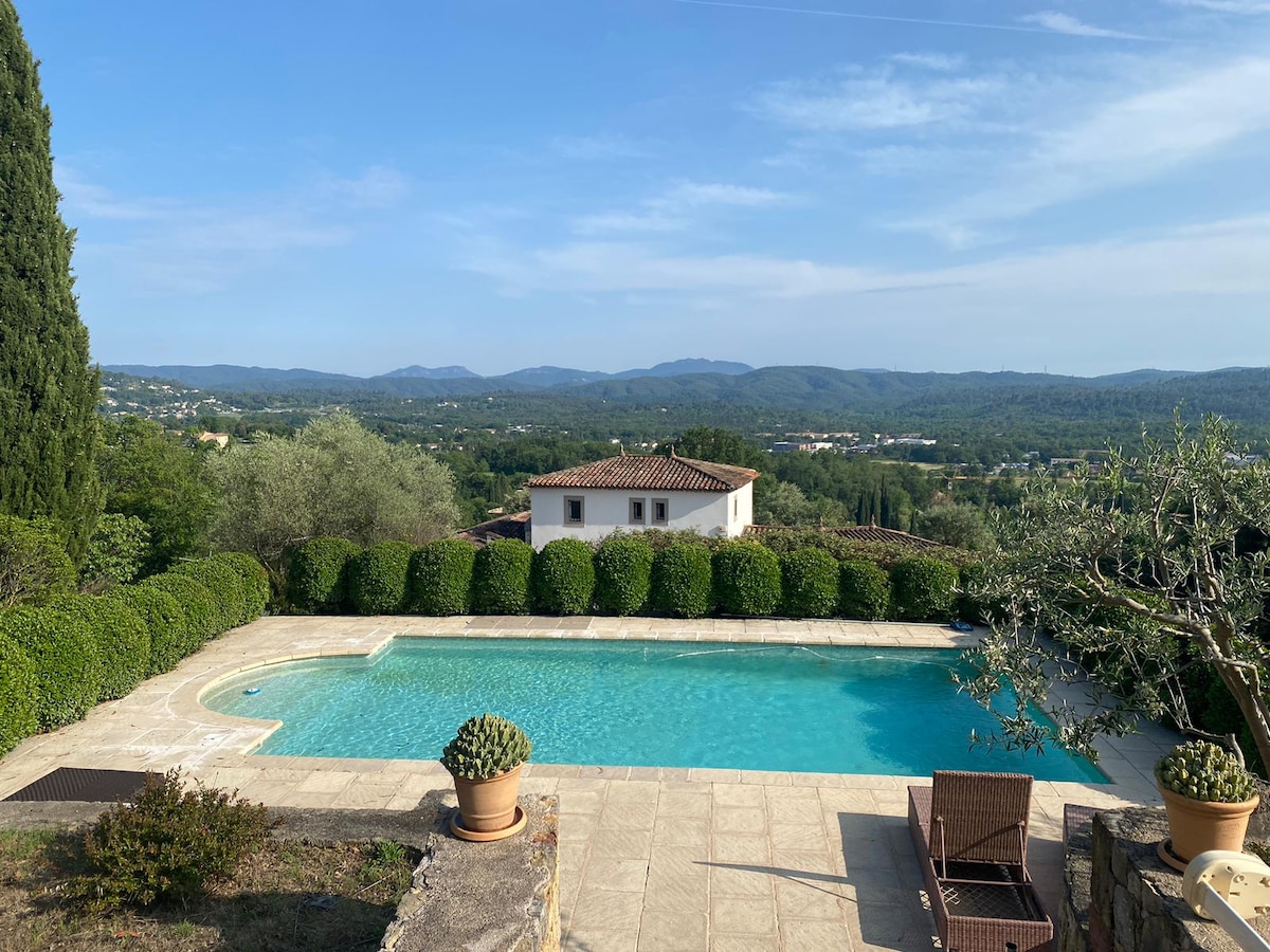 Profitez du calme et du site except situe en bordure d’un espace boisé naturel de 2 hectares avec une vue Exceptionnelle à 360°. Orientée plein sud, sans vis-à-vis, proche de ts les commerces cette Propriété bénéficie d’une immense terrasse, salon climatisé, cuisine équipée, 4 chambres (3 climatisées), 1 sdb (baign et cabine de douche) 2 autres salles d eau une belle piscine de 12x5 sur joli terrain de 3000 m2 ⛱️ poss de location longue durée sur 9 mois de novembre à fin mai