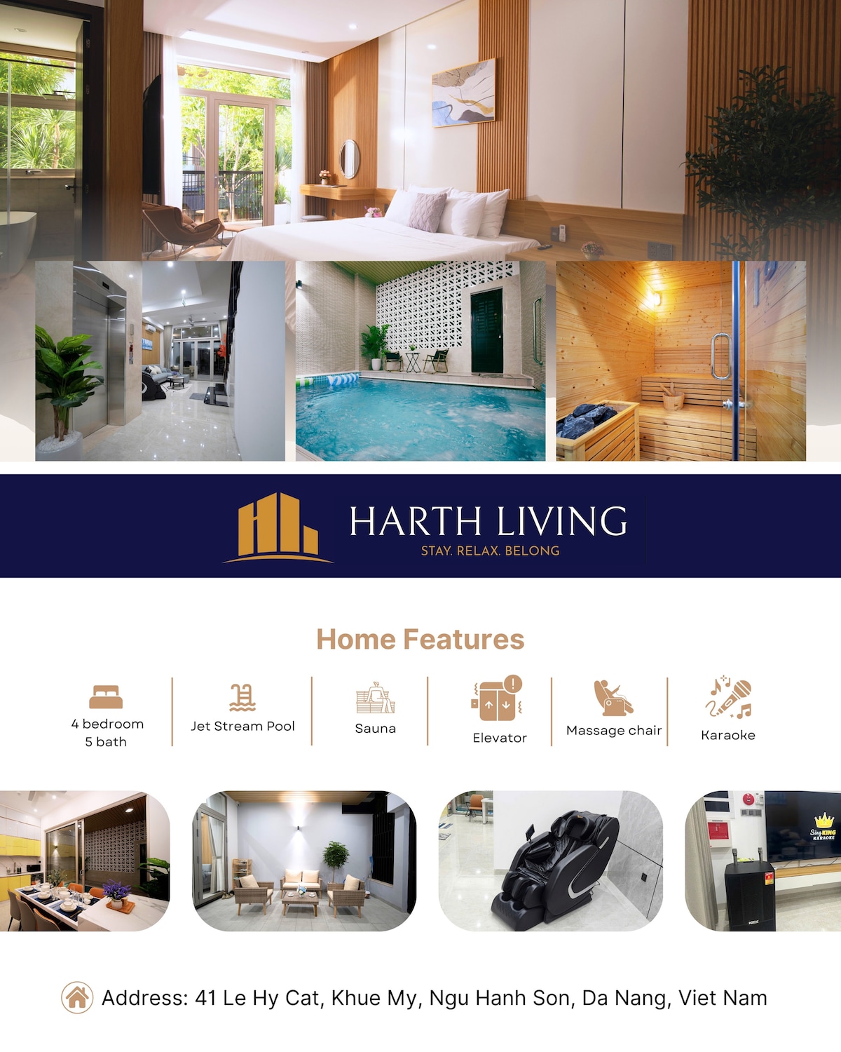 Enjoy coastal living at a spacious 4 Bedrooms with easy car access on a main road, just 2min from My Khe Beach. The 200sqm house is ideal for families, blending French-colonial charm with modern comforts: -4 beds | up to 10 guests -5 bathrooms (rain showers + bathtubs) -Living room + Smart TV -Full kitchen & 2 dining tables -Ultrafast Wi-Fi (500Mbps) -Karaoke (before 10PM) Located in lively An Thuong – Da Nang’s international hub of dining, cafes & nightlife – all just steps from the sea!