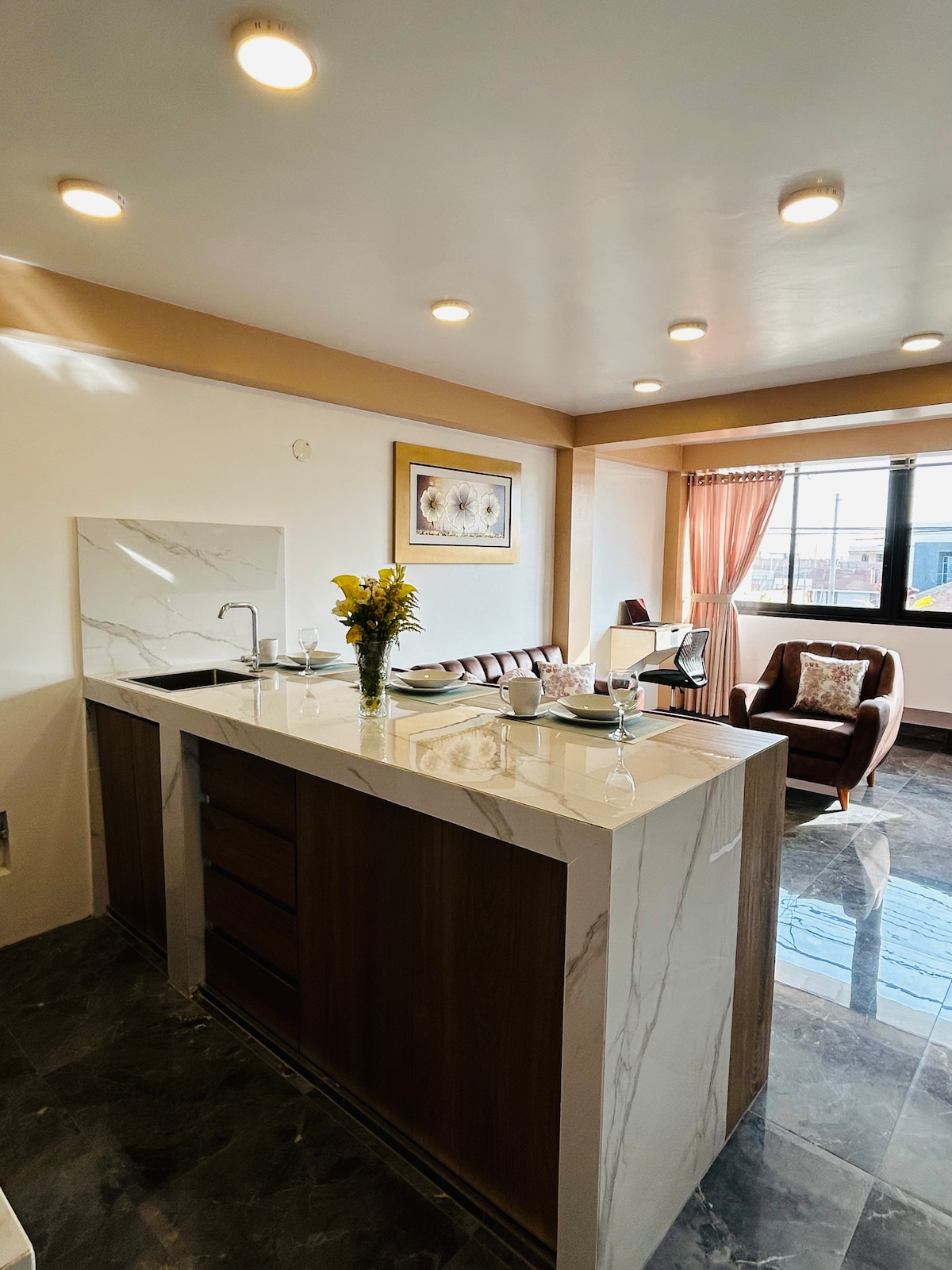 Moderno y acogedor departamento de estreno ideal para parejas o viajeros solos. Cuenta con 1 habitación con cama queen y ropero empotrado, sala cómoda con Smart TV y escritorio, cocina equipada con electrodomésticos modernos y baño completo con agua caliente. Un espacio funcional y confortable, perfecto para una estadía práctica y relajante.