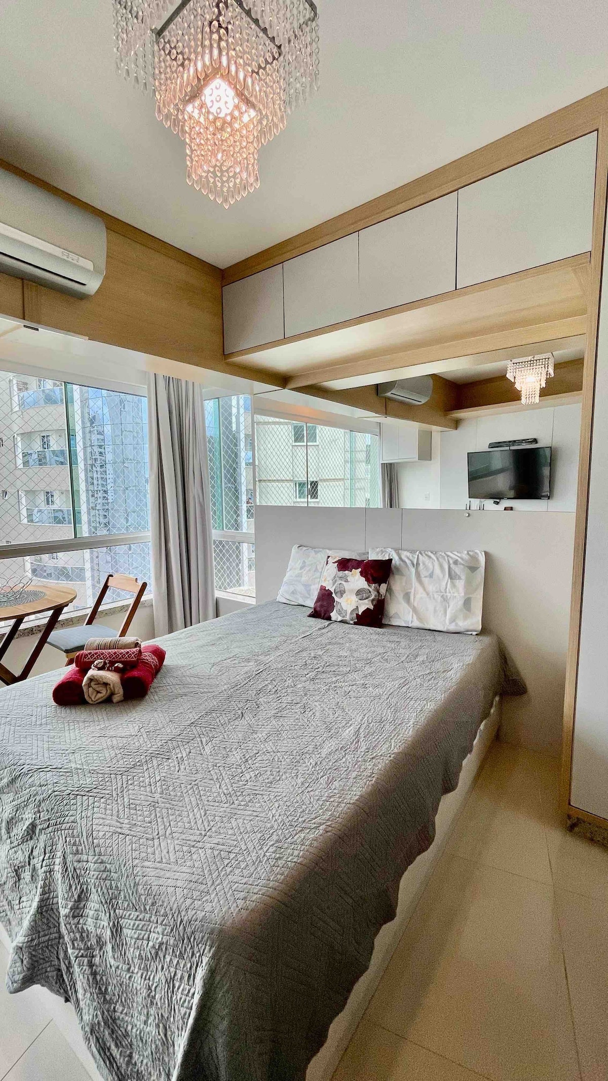 ¡Ideal para enamorarse! Kitnet con vista al mar, montaña y noria. No hay ventanas de otros edificios en el frente. ¡Maravillosa vista del litoral de BC Cómodo y acogedor! Aire acondicionado frío/calor. Piscina, jacuzzi, gimnasio y garaje. Pequeño pero totalmente cómodo. Bien comunicado: los autobuses locales paran enfrente. Cafetería y pizzería, tienda de conveniencia y lavandería autoservicio 24 horas dentro del edificio. Quiosco de alquiler.