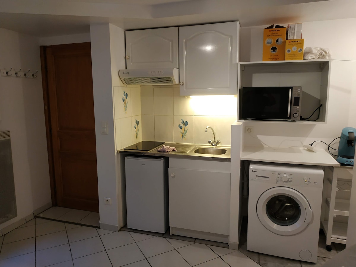 Situado a 850 m del centro de la ciudad, a 1,4 km (15 minutos a pie) de la estación de tren. Pequeña casita renovada en 2021. En verano, disfrutará de la pequeña terraza con su plancha y aire acondicionado. El alojamiento se compone de un salón con una cocina equipada (máquina de café Nespresso, hervidor de agua, vitrocerámica, horno, microondas, heladera+congelador, vajilla...), TV y WIFI, así como un gran dormitorio con su cama queen-size. un baño independiente y un baño MUY PEQUEÑO.