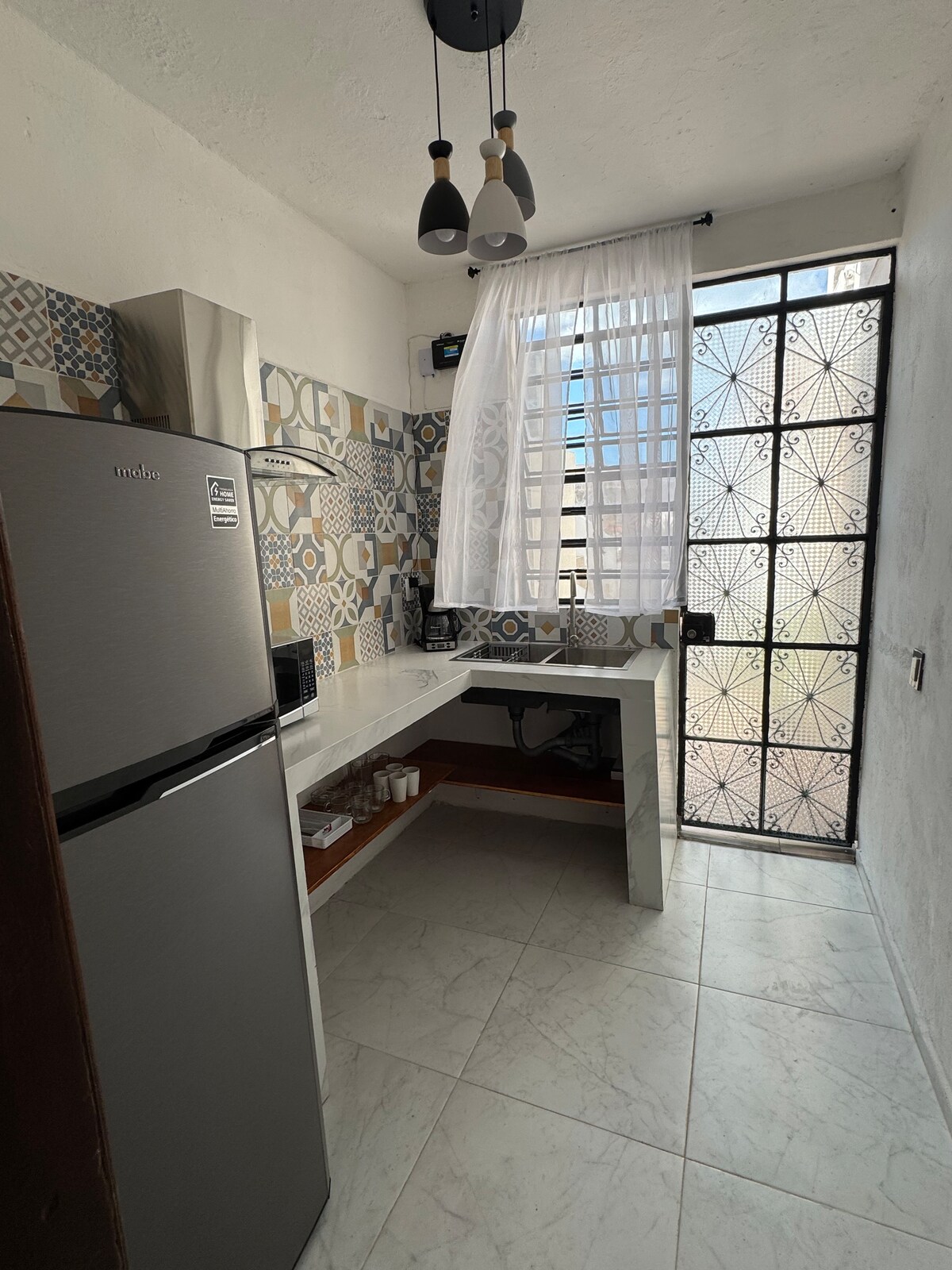 Dpto. con cama king size ideal para 3-4 personas , con hamaca extra si la desean para la 4ta persona, cuenta con tv , Disney+, Netflix , hbo Max , YouTube, etc. , aire acondicionado, refrigerador, cafetera, utensilios de cocina, lugar cómodo y privado. Cuenta con cámara de seguridad en el espacio destinado para su automóvil, cargador para auto eléctrico”costo extra De igual manera contamos con renta de scooters eléctricos Xiaomi , por si desean trasladarse de un lugar a otro de manera eléctrica