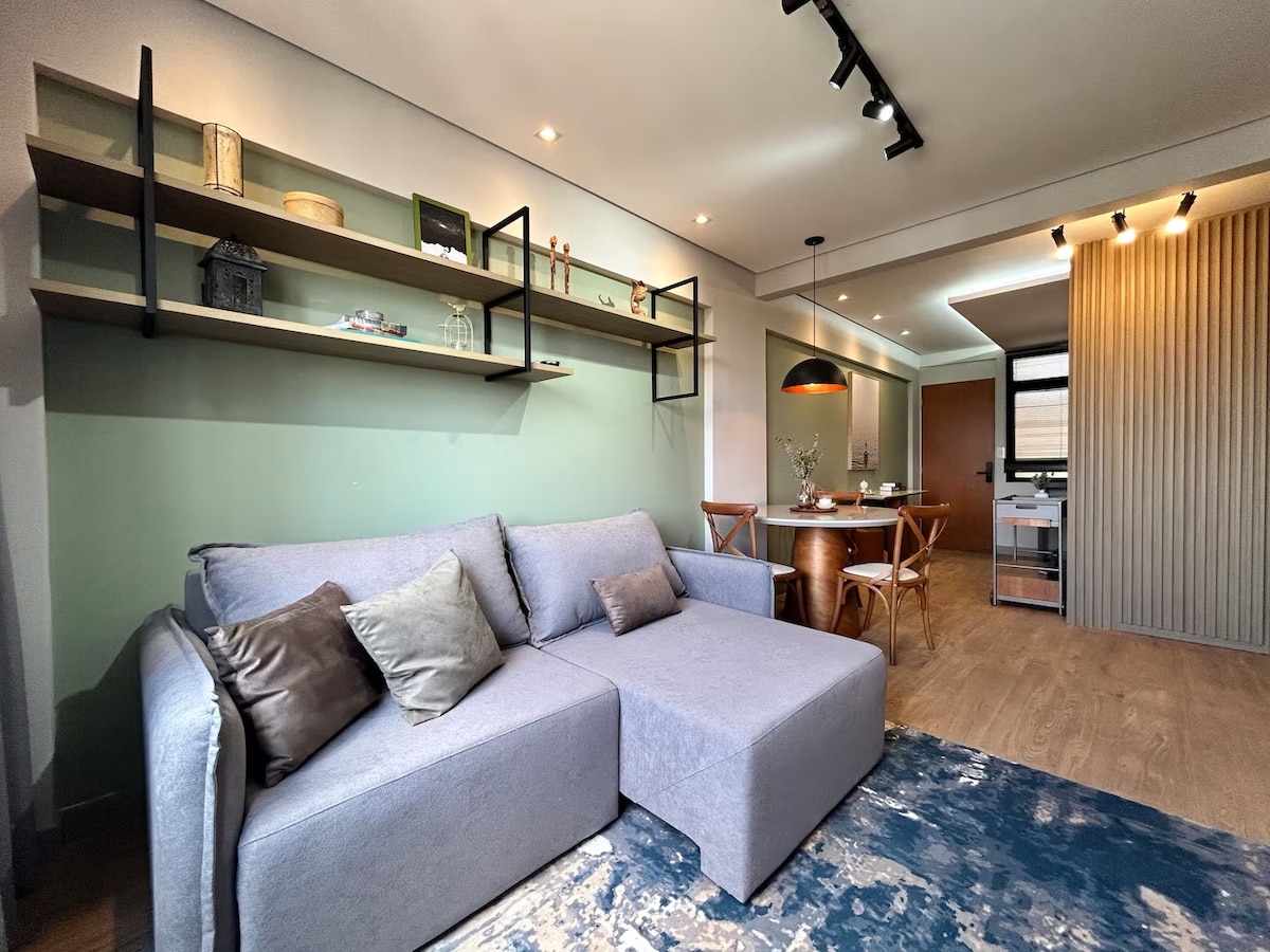 Setin Midtown Campinas te está esperando. Nuestro apartamento estilo estudio tiene 45m2 con un concepto totalmente abierto, completo en utensilios, con aire acondicionado, todas las comodidades que le gustaría tener en su alojamiento combinado con una decoración moderna. Contamos con garaje privado, conserjería 24 horas y "mercadinho". Estamos a 10 minutos del aeropuerto de Viracopos, a 5 minutos del Royal Palm Eventos.