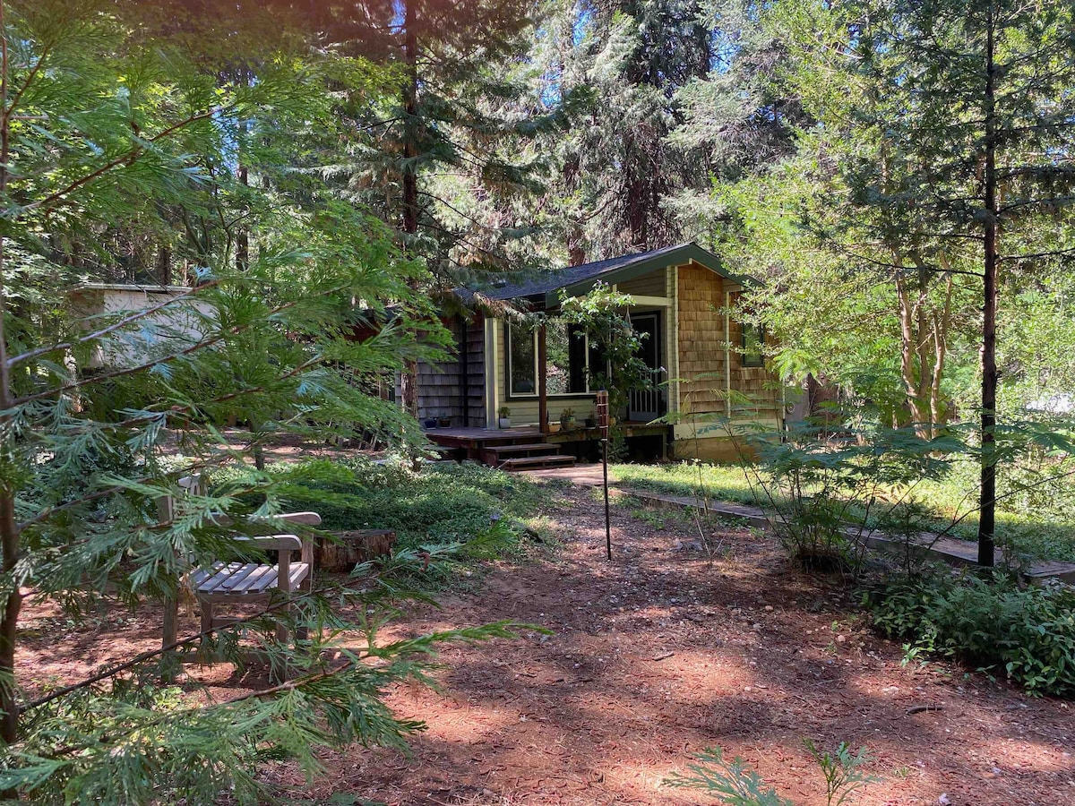 Indulge in rustic-elegance, charm and comfort. Our luxurious fairytale cabin is built of warm toned cedar wood and floors: a gourmet kitchen, soaking tub for two, wood burning stove, hot tub, views. You will experience a full immersion in nature out every window and just one step out the door. Just a short ten minute drive from historic Nevada City, shopping, restaurants, theater, Deer Creek trail, Yuba River and hiking trails nearby. This studio cabin is perfect for couples or a solo retreat.