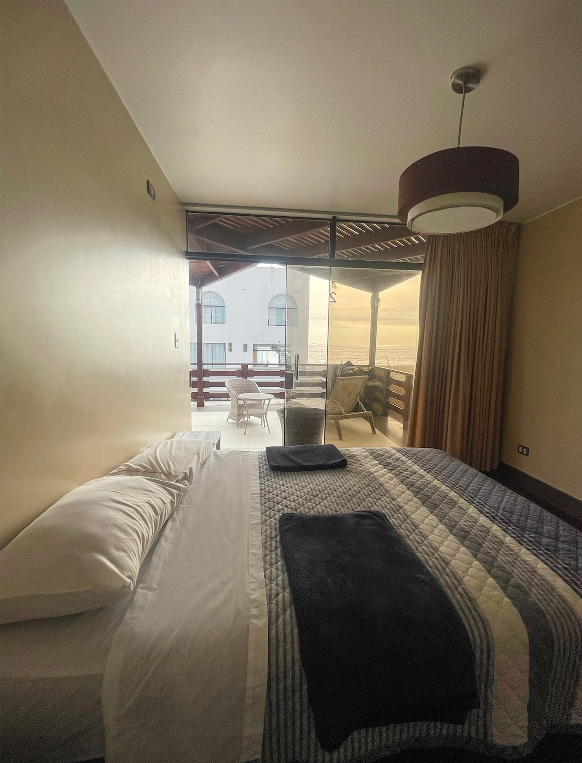 Bonita habitación para pareja, ubicada en el cálido valle de Calango, a 1 hora y media de la ciudad de Lima. - Para 2 personas. - Cama king (3 plazas). - Baño privado. - Mesa + 2 sillas. - Balcón Además en las áreas compartidas: - estacionamiento privado. - zona de parrilla. - Zona de fogata. - Zona de wifi. - Piscina para niños y adultos. - áreas verdes - Restaurante - juegos de fulbito y sapo. Horario: Check-in es a partir de las 3 pm y el check-out hasta las 12 pm