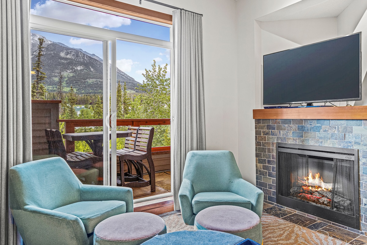 Top floor 1 bedroom suite offering stunning views of Lady Mac & Grotto Mountain from a private balcony: - 15 min walk to downtown Canmore - 15 min drive to Banff - Free High-speed Wi-Fi & Cable - Free Banff Park Pass - Heated Underground parking with EV chargers - Master bedroom with King Bed, walkout to balcony - Living Room with fireplace, TV & a plush couch that can easily be pulled out into a queen bed - Full access to Resort shared amenities like heated pool, 2 hot tubs & BBQ/Patio area