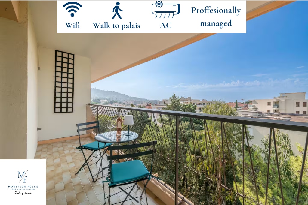 Hyper centre, Rue des belges, en face du Palais des Festivals, la Croisette, et les plages. Charmant immeuble art-déco, au 5 eme et dernier étage avec ascenseur. Spacieux 2 pièces de 45 m2 avec terrasse en teck de 10 m2, qui surplombe les toits, offrant une vue dégagée sur la ville, les montages et la mer, cuisine équipée, séjour bibliothèque, WC séparés avec fenetre, chambre en suite avec dressing et salle de douche. L'appartement est climatisé et peut héberger. jusqu'à 3 personnes.