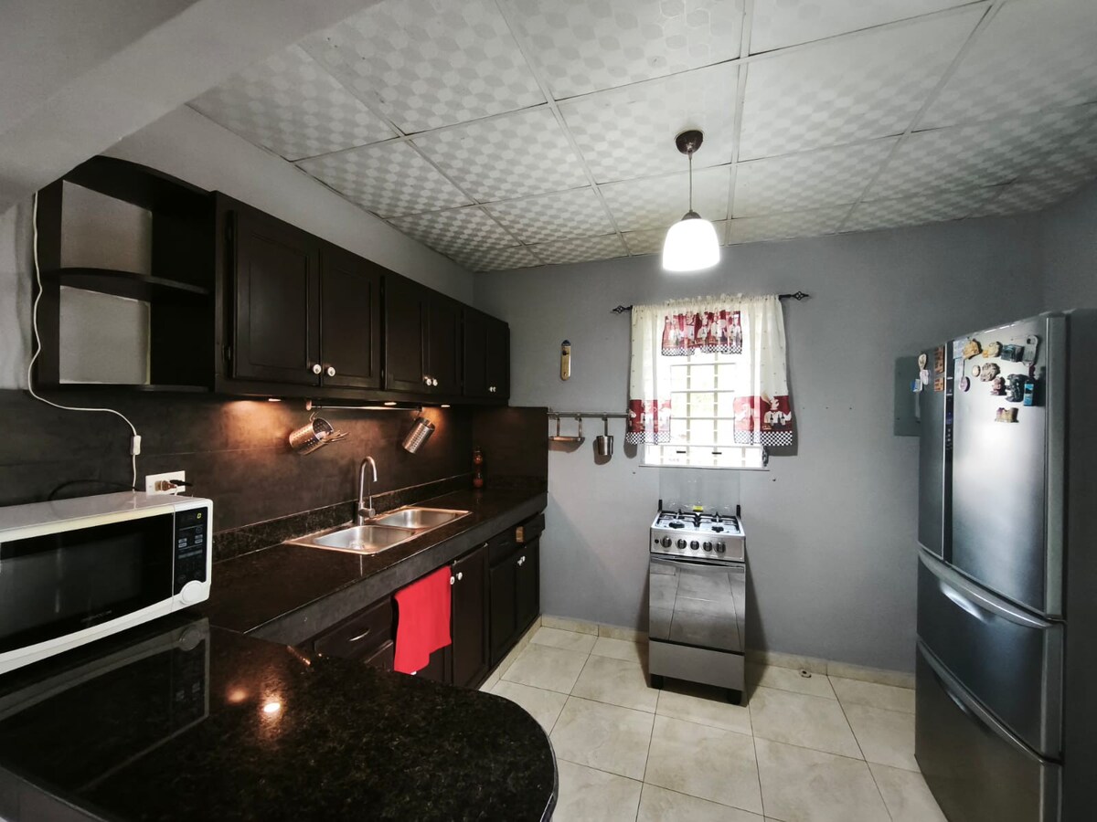 Casa amplia y tranquila en zona segura de Santiago, muy cerca de la vía interamericana, de 4 habitaciones (ideal familias y grupos), sala-comedor y cocina amplia para compartir con familia o amigos, con una oficina. Wi-Fi de alta velocidad, A/C en todas las habitaciones, cocina equipada, lavadora/secadora y caja fuerte de seguridad. Check-in con cerradura inteligente, estacionamiento para varios autos y estación de café con juegos de mesa y un buen karaoke.