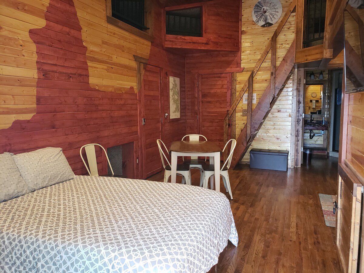 Rustic Highland is a 740 sqft tiny luxury cabin full of warmth and charm, featuring stained cabinetry and boho-inspired accents. The bright living area flows into a fully equipped kitchen, and the spa-like bathroom adds a touch of luxury. The main bedroom has a queen-size bed with ample storage, while the loft offers another queen bed and stunning canyon views. Outside, enjoy the private patio with a bistro table and grill, all set on the edge of Palo Duro Canyon for an unforgettable experience.