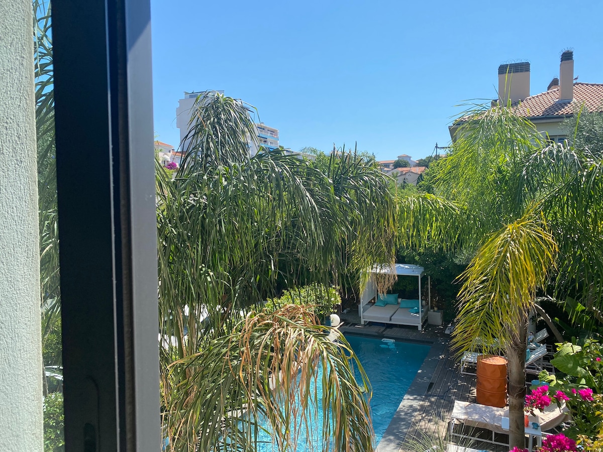 Estudio moderno con aire acondicionado de 27 m² con jardín y terraza de 26 m², muy relajante con vistas al pinar y vistas al mar en el lado del jardín, la playa está a 50 m a pie sin tener que cruzar la carretera, que da acceso a las calas del sendero costero a lo largo del cabo Nègre Aparcamiento con plaza privada en una urbanización cerrada. Puerta de entrada: refuerzo seguro de 5 puntos.
