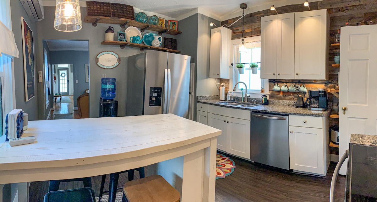¡Con menos de 470 pies cuadrados, esta casa de los años 20 es súper divertida y está lista para ser disfrutada para parejas, amigos y familias pequeñas! • Cama tamaño king con smart TV en el primer piso • Dos camas individuales en un acogedor loft para dormir • Cocina pequeña con estufa de propano, cafetera Nespresso y sala de estar con televisor inteligente • Patio con parrilla de carbón, estufa solitaria y mesa de comedor • Tabla de surf y flotadores Lee nuestra exención de responsabilidad totalmente honesta a continuación. *Tenemos una cámara de seguridad en el exterior delantero de la casa.