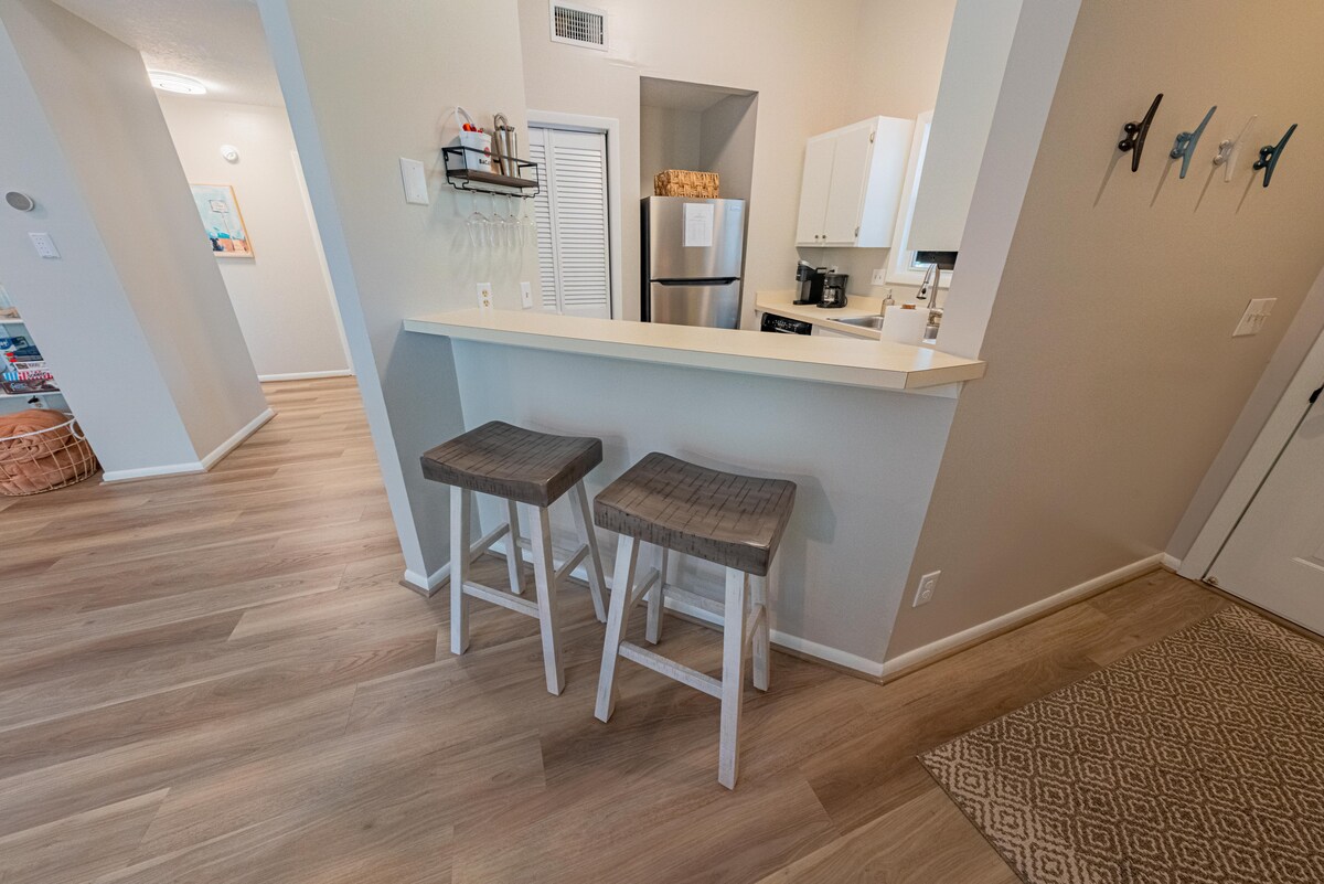 Disfruta de un pequeño oasis junto al gran Atlántico. Estaciona tu coche y camina hasta algunos de los mejores restaurantes y bares de OBX. Vuelve y relájate junto a la piscina, da un paseo por la playa a través del acceso privado al condominio o relájate en tu condominio con jardín. El apartamento Blue-Green Gardens es tranquilo y cómodo, con muchas plantas para mejorar la tranquilidad y el rejuvenecimiento. Esta joya es perfecta para una pareja o una familia pequeña. En temporada baja, alójate 2 noches o más. Del 17 de junio al 12 de agosto, alquiler por semana.