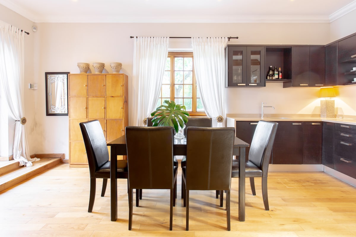 Déjate mimar por la elegancia de antaño en la mansión de Mount Pleasant, que data del siglo XIX. Cena al aire libre junto a tu piscina privada en esta histórica propiedad ubicada bajo la montaña de la Mesa. Relájate con una copa de vino del Cabo en la elegante y romántica suite de invitados con su propio jardín sembrado de vides, o acurrúcate en un sillón junto a la gran chimenea de piedra. La espaciosa y amplia suite de invitados de planta abierta es ideal para parejas y familias jóvenes. Situado en el centro de la frondosa Newlands, a pocos pasos de los famosos estadios deportivos, UCT y SACS. La casa ha sido recientemente renovada y es una casa familiar, y la propiedad de Mount Pleasant es una parte interesante de la historia de Ciudad del Cabo, que data del siglo XVIII. La suite con entrada independiente es ideal para una pareja o familia y consta de: - Un gran dormitorio-salón de planta abierta (3-4 plazas). - Una cocina completa. - Baño con bañera, ducha y tocador doble. - Una piscina privada de entrenamiento. - Jardín privado con vistas a la montaña de la Mesa y al Pico del Diablo. En verano, es imprescindible descansar junto a la piscina soleada, cenar al aire libre y disfrutradicional «braai» sudafricano (barbacoa) y, en invierno, el fuego crepitante, la cocina completa y la televisión proporcionan un refugio cálido. El dormitorio-salón es de planta abierta con cocina y baño separados. Cama tamaño king, un sofá cama individual y una cama individual adicional instalada en la suite para el cuarto huésped si es necesario. TV por cable y wifi están incluidos. Se ofrecen botellas de vino y bebidas, servicios de lavandería y limpieza. Otros extras que pueden estar disponibles son: uso del comedor baronial para reuniones (con capacidad para 18 personas) u ocasiones especiales (solo durante el día). Nota: la piscina NO está vallada y está inmediatamente al lado de la suite, así que ten especial cuidado (por lo tanto, el espacio no está recomendado para niños que no sepan nadar). Jardín y piscina privados Aparcamiento fuera de la calle para 1 coche. Uso del gran comedor bajo petición. Los huéspedes pueden disfrutar de total privacidad, pero la familia y el personal doméstico suelen estar en casa para darte la bienvenida y estarán encantados de responder preguntas y ayudarte por teléfono o mensaje de texto. Nuestros amables perros, Boris, Frankie, Josh y Pixel, siempre te darán una cálida bienvenida (pero tu jardín y ala son privados, por lo que los perros no te molestarán). Newlands es uno de los suburbios frondosos originales de Ciudad del Cabo que limita con la Universidad y la residencia del Presidente del Estado. Encantador y protegido de los vientos de verano, y a poca distancia a pie de cafeterías, restaurantes y tiendas. Newlands es perfectamente céntrico para la mayoría de las excursiones más populares de Ciudad del Cabo. La montaña de la Mesa y el teleférico, el paseo marítimo V&A, las playas, las granjas vinícolas y el centro de la ciudad se encuentran a 10-25 minutos en coche y hay Ubers, etc. disponibles. El barrio periférico de Newlands en sí tiene muchas atracciones, pero para disfrutar de la oferta completa de Ciudad del Cabo te recomendamos alquilar un coche o tomar un taxi (Uber o taxi por teléfono). Los guías o conductores privados también te recogerán directamente en las instalaciones. En el aeropuerto hay disponibles traslados/lanzaderas/taxis o se pueden reservar a través de una empresa de traslados. ALBERCA Importante: la piscina no está protegida con una red o valla y está inmediatamente al lado de la suite, así que ten cuidado y NO recomendamos la suite para bebés/niños que no sepan nadar. MASCOTAS Podemos alojar mascotas bajo petición, pero ten en cuenta que hay perros residentes. EXTRAS Los extras, como el vino, se pueden pagar en efectivo o a través de la aplicación SnapScan. REUNIONES Y FUNCIONES El comedor baronial se puede reservar para reuniones especiales y funciones diurnas (tarifas/disponibilidad bajo petición). Es una habitación bonita y tiene capacidad para 14-18 personas. SESIONES FOTOGRÁFICAS Y UBICACIÓN La casa solariega Mount Pleasant y los terrenos pueden estar disponibles para sesiones de fotografía/cine profesionales. Esto tendría que ser por acuerdo especial directamente con los propietarios o sus agentes. Las tarifas varían según las características de la sesión. (Nota: el uso del espacio para huéspedes para sesiones comerciales tendría un coste adicional y no está incluido en la tarifa de alojamiento).