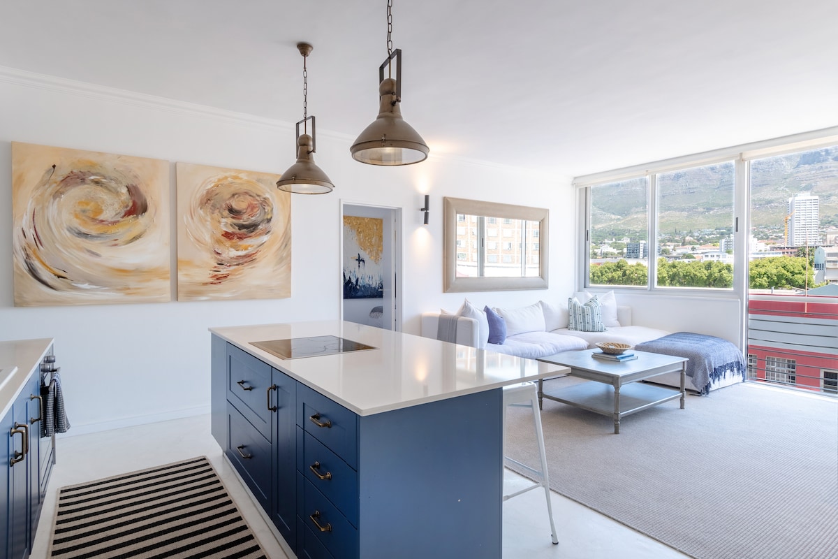 Empieza con vistas inigualables a la montaña de la Mesa antes de salir a ver los lugares más emblemáticos. Con sus espacios blancos limpios y su cocina de cielo azul, esta casa es un lugar ideal para volver después de un día divertido. Dirígete a la azotea compartida para disfrutar de unas vistas más impresionantes. Estás en una de las áreas más privadas del edificio. El rincón más alejado, mirando directamente hacia Table Mountain. ¡Entra, deja tus maletas y disfruta!