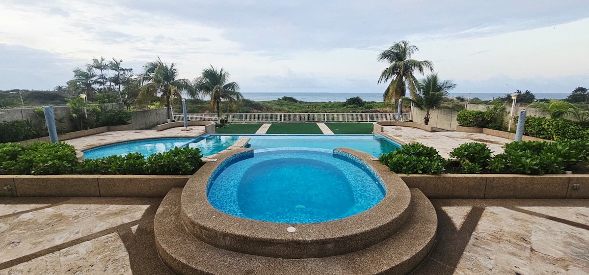 Espectacular PH duplex con Vista al Mar en todas sus areas, posee Wi-Fi, A/A en todas las areas del PH, 3 habitaciones espaciosas, 4 baños completos, sala, comedor, microondas, horno, amplia terraza con parrillera y vista al mar infinito, agua caliente ilimitado, cocina equipada. 2 puestos independientes techados, piscina, duchas y salida directa a la playa. Date la oportunidad de la exclusividad, lujo y confort que mereces.