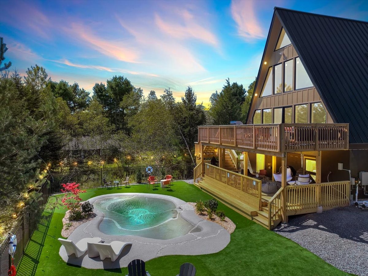 Cabaña alpina cerca del lago con árboles altos y jacuzzi
