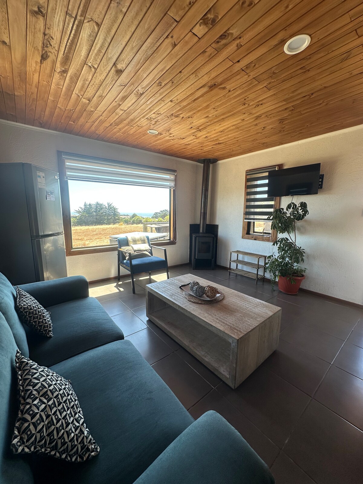 Cabaña con cocina equipada completamente. El Living cuenta con estufa a combustión lenta. 2 Dormitorios con sus respectivas ropas de cama. 1 Habitación con cama matrimonial y otra Habitación con 2 camas. Cuenta con toallas de cuerpo y manos. Baño con jabón. Con estacionamiento para un vehículo. La cabaña está ubicada a 20 min del mar caminando aproximadamente, en zona de seguridad ante tsunamis. Sector tranquilo y comercio cerca. Pequeña terraza con mesa, sillas, parrilla y vista al Mar.