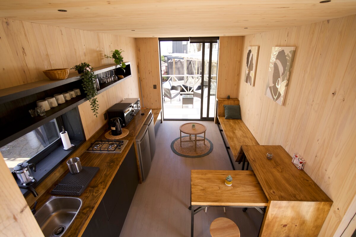 Temporada baja en Tiny! -50% en la tercera noche (no incluye feriados ni vacaciones de julio) Ven a disfrutar del encantador bosque. Descansa rodeado de flora nativa y el canto de las aves. Hot tub privado para una estadía mágica! Ubicados en El Manzano a 20 minutos de Playa Puertecillo. La cabaña se encuentra junto a nuestra casa familiar, con 100% de independencia, acceso aparte y estacionamiento propio. * No se admiten mascotas. * No se permite música fuerte o ruidos molestos
