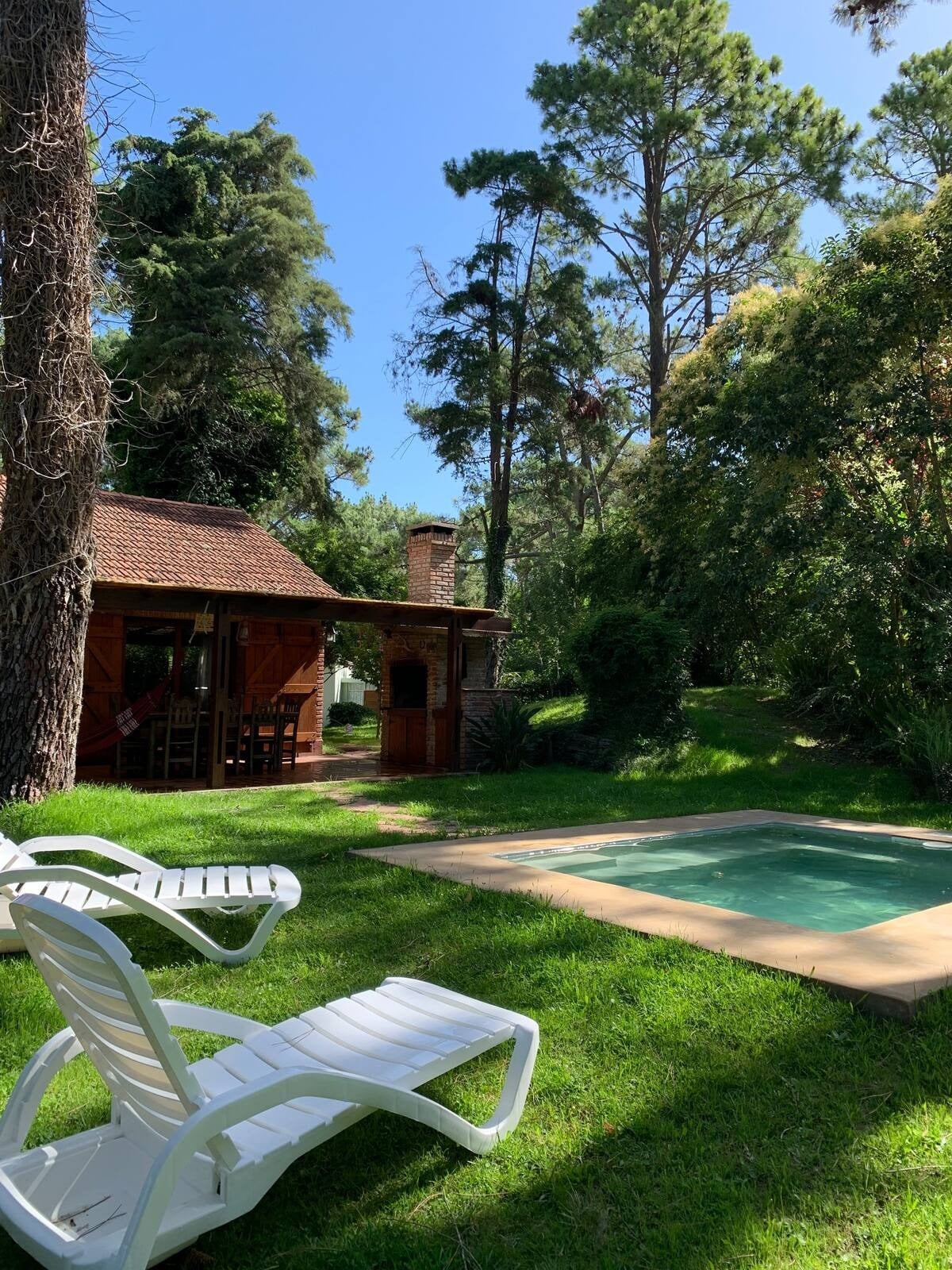 Cabaña en hermoso entorno arbolado, parque de 700 m2. Cocina comedor muy luminoso con vista abierta al bosque, deck de madera con muebles de exterior para disfrutar el aire libre, parrilla y fogonero. Living con salamandra y 3 camas simples, un primer piso con una cama Queen size. Dos baños completos, lavarropas, aire acondicionado frío/calor. Lugar de estacionamiento para dos autos. Alarma, wifi, Smart TV (Netflix y Youtube). Elementos de playa: sombrilla, reposeras, lona