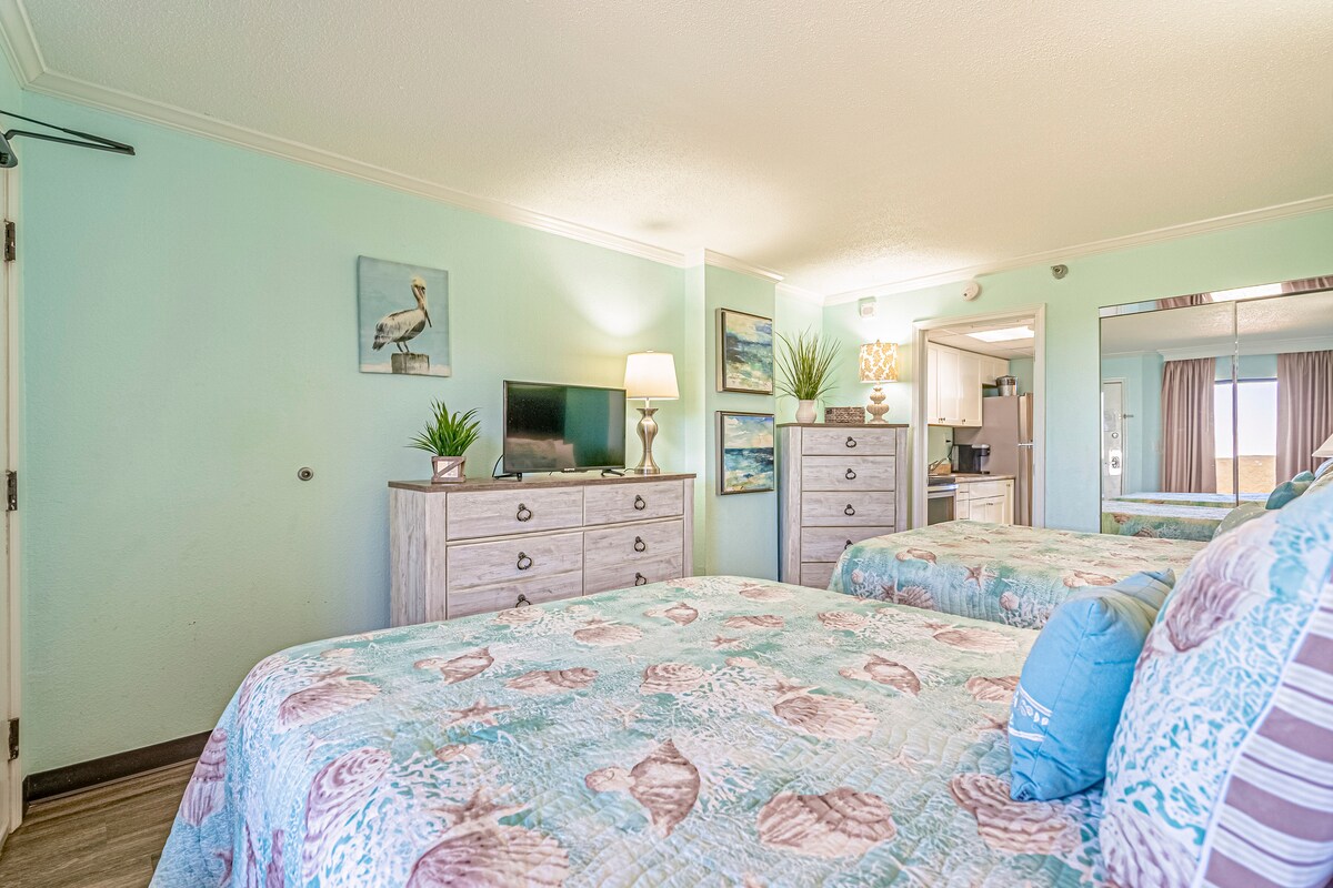Escapada frente al mar: ¡relájate y relájate! 🌊 Relájate con tu café matutino (o un mimosa, sin juicio aquí) y disfruta del amanecer desde este impresionante estudio frente al mar en el piso 11. Este refugio playero y lleno de ambiente tiene todo lo que necesitas para una escapada relajada: dos acogedoras camas tamaño queen, un baño elegante de azulejos y un balcón privado frente al mar con vistas que se extienden hasta donde alcanza la vista. ¡Sal a disfrutar de las piscinas y la música en vivo todas las noches en Ocean Annie, uno de los mejores bares de playa de los alrededores!