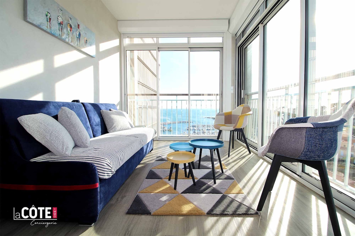 superbe appartement avec une vue à couper le souffle sur la mer..Au 1er étage d'une résidence avec place de parking et gardien.Une entrée par la mer, une par la ville,Portail automatique. Gare à moins de 5mn à pieds le port à 2 pas. marché le dimanche.superbe corniche pour les sportifs et les randonneurs. Terrasse de 36m2,toute équipée avec plancha.2 chambres une avec lit 160×200 à l étage avec rangements, la deuxième lit en 140×190 Salle d eau avec grande douche et WC Cuisine équipée