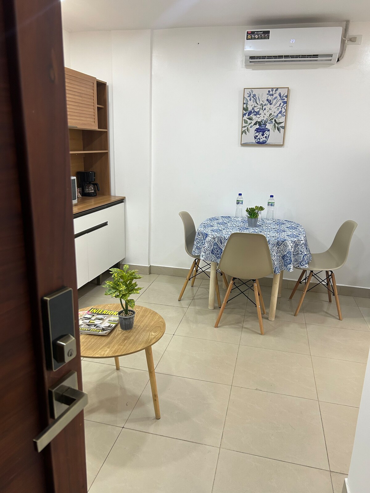 Relájate en una suite cálida y elegante pensada para parejas. Disfruta una cama amplia, iluminación suave, Smart TV gigante y una decoración en madera que crea un ambiente íntimo y relajante. La cocina está equipada para preparar algo especial, y también podrás disfrutar de la piscina y áreas exteriores tranquilas. Ubicación exclusiva en Unioro, cerca de restaurantes y zonas seguras para caminar en pareja.