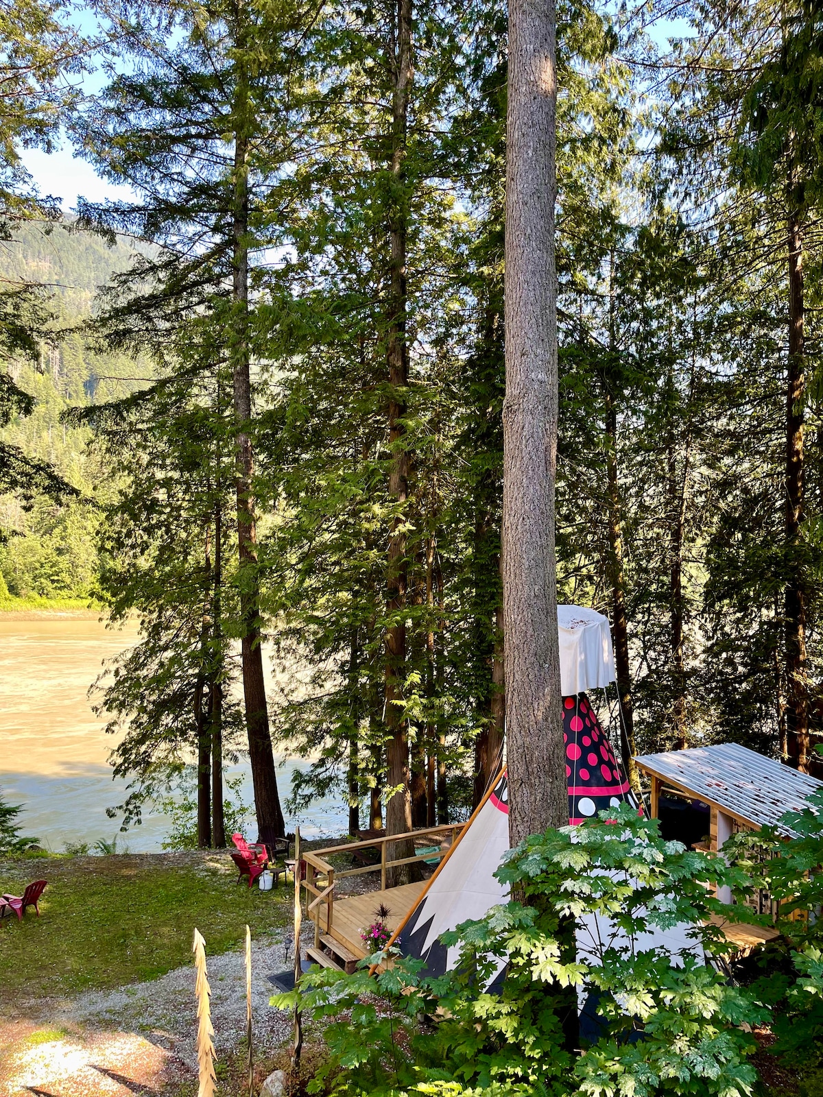 Este es uno de los 3 tipis frente al mar, a pocos pasos del río. El tipi de oso de 21 pies tiene capacidad para 4 personas. Hemos añadido algo nuevo este año: un tipi infantil de 8 pies. Este sitio cuenta con un nuevo jacuzzi Saluspa, una cocina al aire libre, barbacoa, estación de cocina de propano, mininevera y una mesa de pícnic. Viene con su propio baño privado y una ducha al aire libre. Hay ropa de cama de calidad, jabón casero y champús y acondicionadores ecológicos.