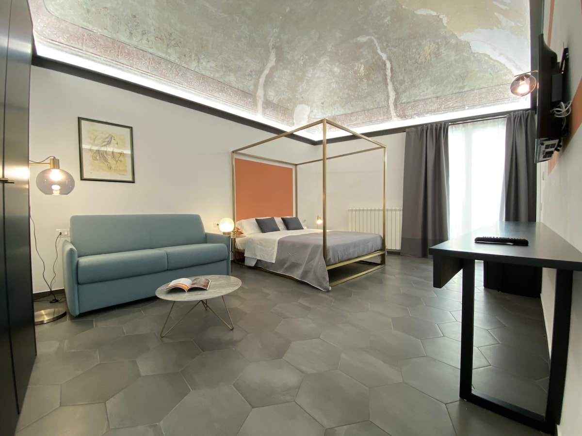 La camera Dionisio dispone di un letto matrimoniale e un bagno in camera. Pur tuttavia la camera è provvista di molti confort: aria condizionata, tv, internet, set bagno, lenzuola, prodotti per l'igiene personale, che rendono il soggiorno gradevole e pratico. La camera è provvista di bagno privato.