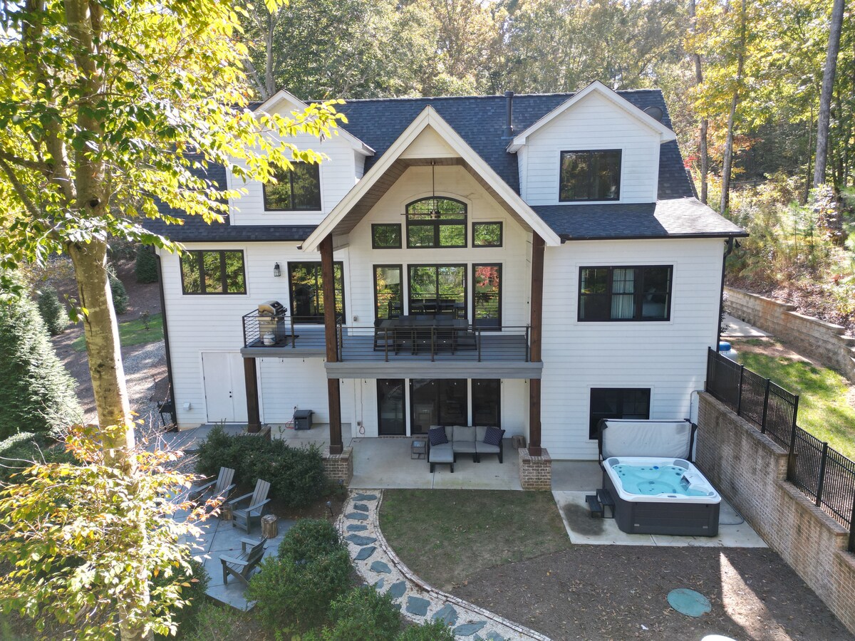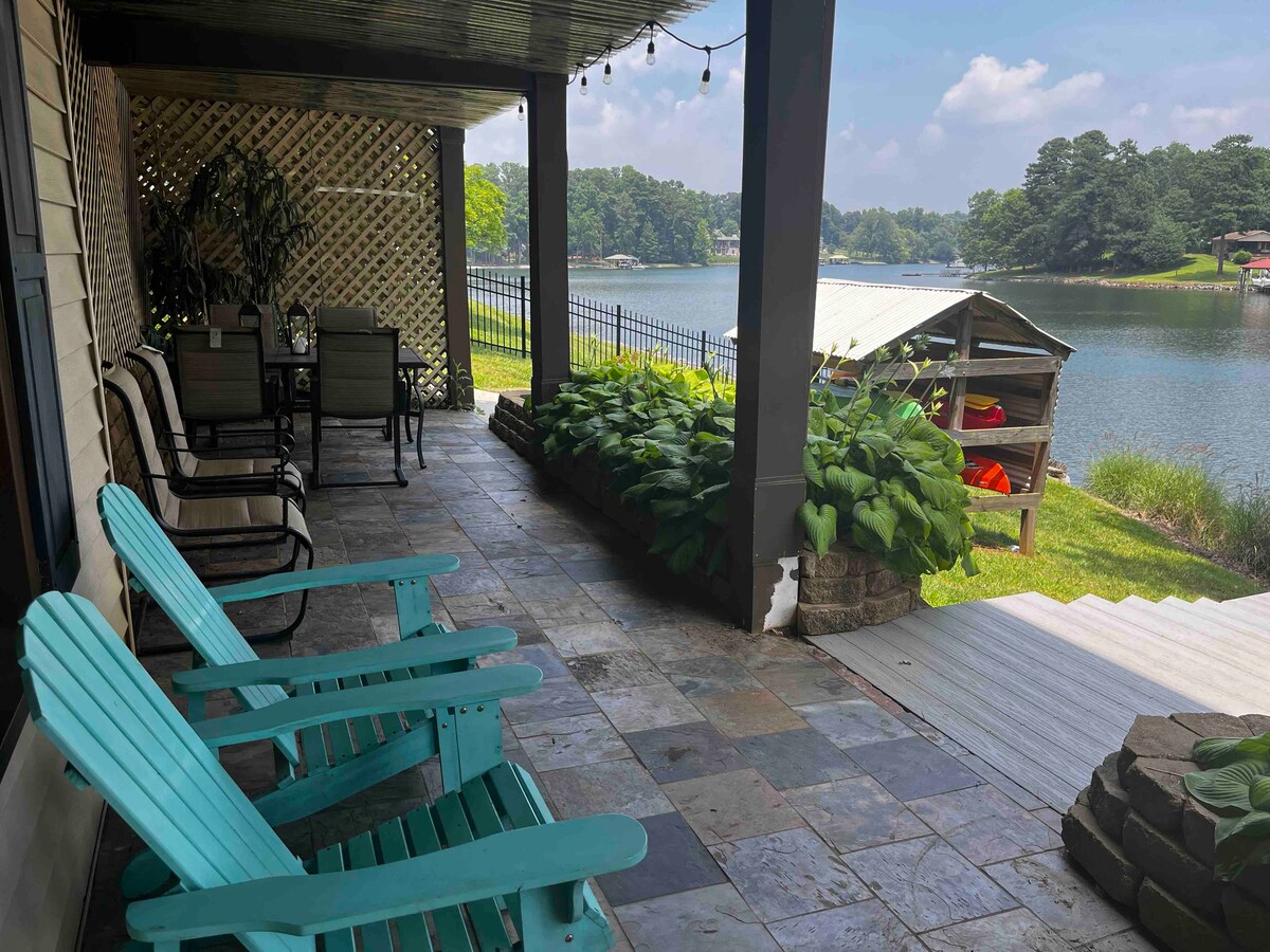 This stylish lakefront home has a private deep-water dock & calm swimming area with 2 natural sandy beaches. Situated at the entrance of a quiet cove overlooking the main channel of Lake Norman, the 1000-sq-ft deck, with dining table, couches, & loungers, wraps around the house providing fantastic views of the lake. Step out from the main living area onto a covered terrace to relax in the shade. Swim at the sand beach or take in a sunset beside the fire on the stone patio at the water's edge.