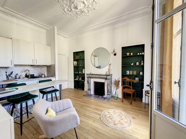 Dans quartier historique, immeuble 1900, idéalement situé à 6mn à pied de la gare et 5mn à pied du centre ville et des transports (tramway, bus). Au 1er étage sans ascenseur, appartement de 35 m² avec déco cosy comportant une cuisine équipée, salle de douche, séjour, chambre (lit 2 places 190x140) et WC indépendant. Vous aurez accès au WIFI gratuitement. Tous commerces à proximité. Situation idéale pour profiter pleinement de Dijon, son centre historique, ses musées, et toute sa gastronomie.