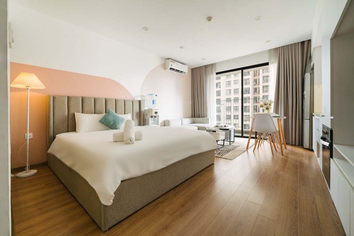 This is a spacious studio apartment located on the 22nd floor of block C2, D’Capitale Complex. With an area of 35m2, the apartment with wooden floors creates a cozy but still airy feeling with a large balcony. Beside the queen bed, the apartment has 1 bookshelf, a large sofa, and a dining table for 2 people. The kitchen is fully equipped with kitchen utensils, suitable even if you have a long stay. The apartment also has a smart SAMSUNG TV with Netflix and fast internet for remote working.