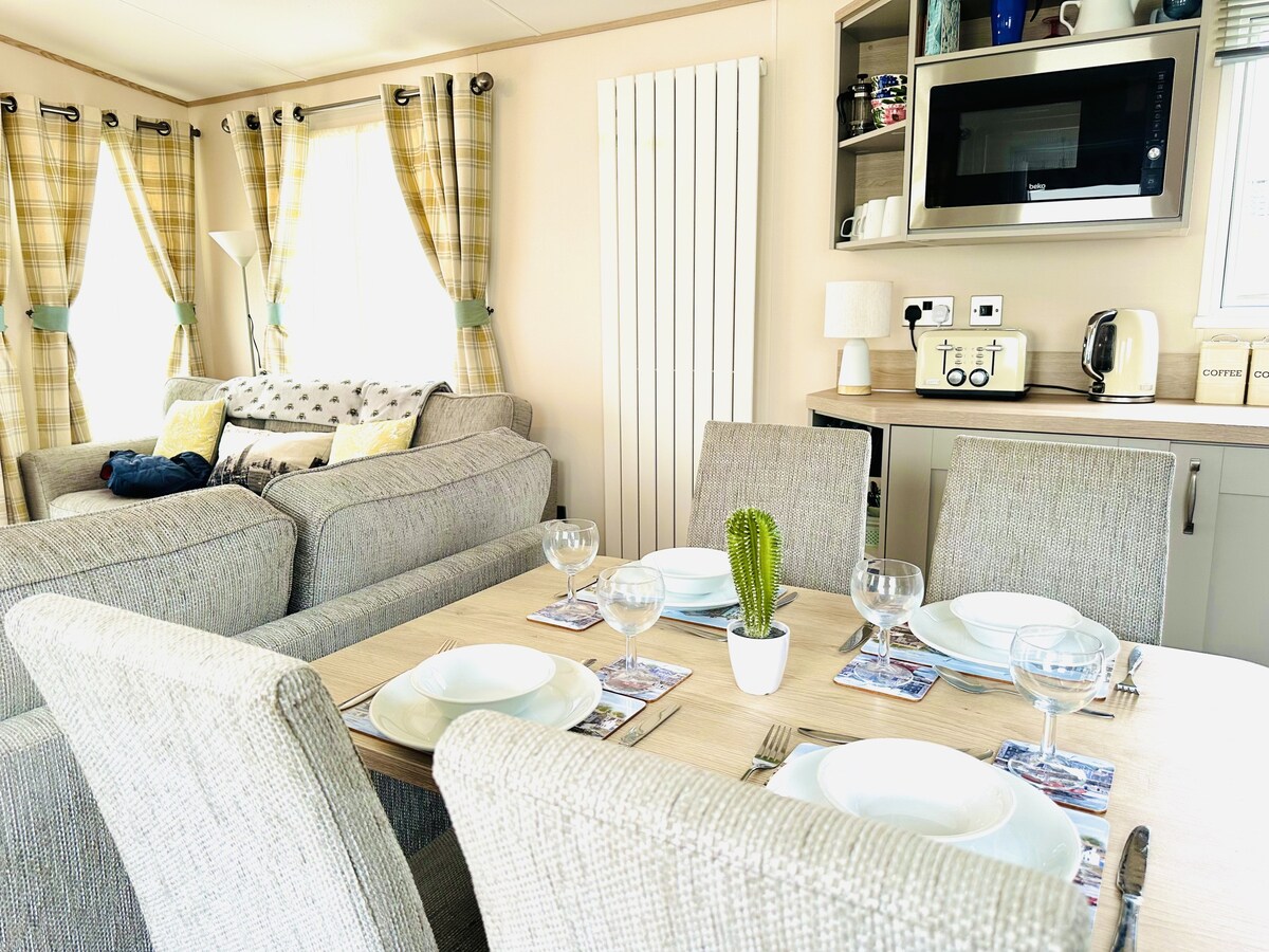 Cabaña de vacaciones totalmente equipada de 41' x 15' con 2 camas y 2 baños, modelo 2021. Ubicado en Park Dean Resorts. Parque de vacaciones Cayton Bay. capacidad para 4 personas Calefacción central de gas. Doble acristalamiento. Plaza de aparcamiento privada propia justo fuera de la puerta. TV con Disney+, lavavajillas, lavadora/secadora, microondas, placa de gas y horno. 2 toallas La ropa de cama Todo completamente conectado a la red. Terraza con frontal de vidrio Unidad de almacenamiento. Pases de entretenimiento comprados en recepción Temporada alta Adulto 26,95 £, niño 22,45 £ a la semana Temporada baja Adulto 21,95 £. Niño 16,95 £ por semana