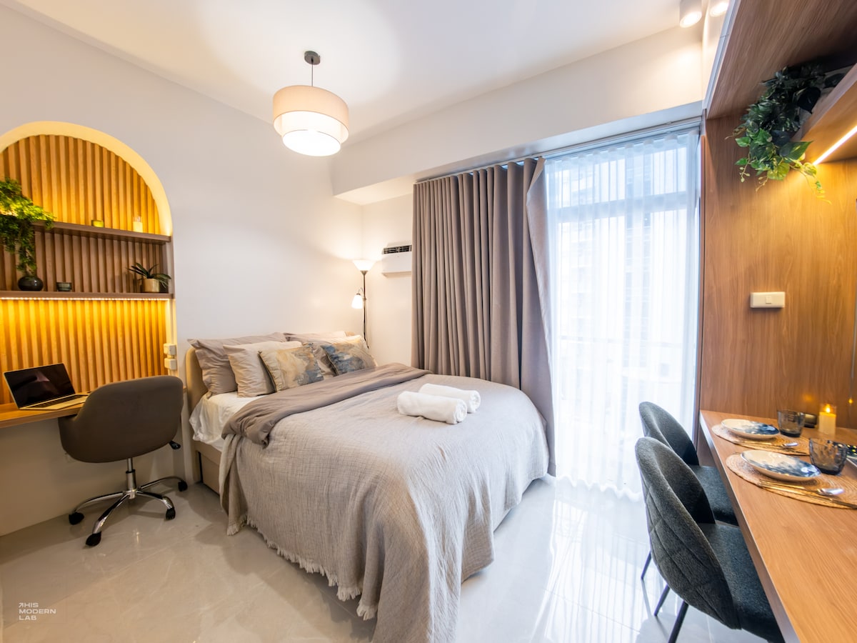 Disfrutá de una vida de alta gama en este estudio de lujo en el piso 22 de Park Avenue 38, IT Park, que ofrece elegantes vistas a la ciudad y a la bahía. Ideal para cuatro personas. Disfrutá de un proyector de cine privado, un lujoso sofá cama, plantas de interior y aire acondicionado que mata los gérmenes. Cuenta con ducha con agua caliente y fría, cocina completa y servicio de limpieza diario. 7-Eleven está en la entrada, rodeado de los mejores cafés y restaurantes de lujo las 24 horas, los 7 días de la semana.