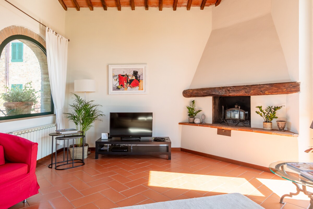 Ancient stone house from the 15th century in a small renovated medieval hamlet in the heart of the Chianti Classico. Located on top of a hill between Florence, Siena and San Gimignano. TENNIS COURT+ SWIMMING POOL Splendid view over the valley. Independent entrance; On the ground floor: large living room with two sofas, dining area and open kitchen. On the 1st floor: 2 bedrooms and 1 bathroom with shower; Private garden with terrace - table and chairs for eating under the gazebo and sun loungers