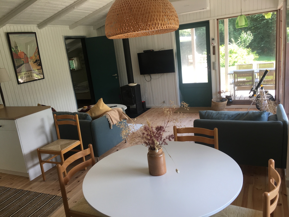 Relájate en una cómoda cabaña, en tu propio pequeño bosque de árboles viejos, hasta el hermoso lago. El tranquilo paraíso privado está a solo 20 minutos de Legoland, y el banco junto a la mesa del comedor está lleno de Lego Duplo ;) ¡La terraza cubierta con sofá cama, la nueva estufa de leña, el internet ultrarrápido y el gran televisor inteligente garantizan unas vacaciones en todo tipo de clima! Te encantará esto después de un día concurrido en los parques :)