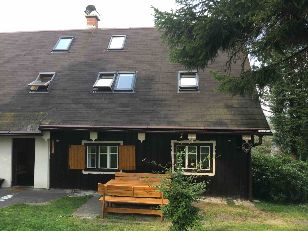Stylové ubytování v srdci Jizerských hor, kde najde každý to své - ideální pro milovníky pěší i cyklo turistiky, pro skupinu přátel i rodinu s dětmi, pro hledače adrenalinu, kteří se vyřádí na Singltreku pod Smrkem i ty kteří hledají klid a relaxaci v přírodě.....a nebo s vínkem ve vířivce. Děti jsou u nás jako doma - mysleli jsme na ně. Najdou tu paradní domeček se skluzavkou, pískoviště, záhon borůvek, vlastní potůček a všechno ostatní, co mohou potřebovat.