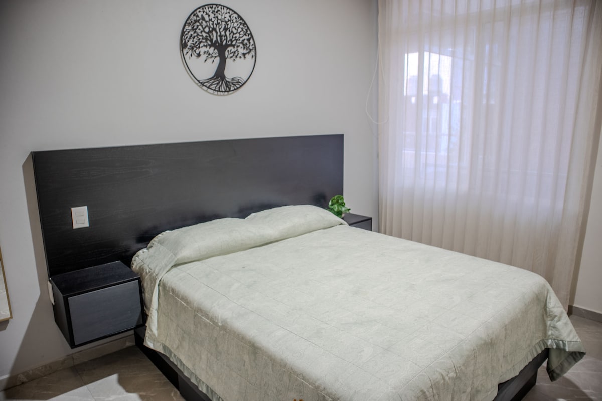 Habitaciones privadas con áreas compartidas con otros huéspedes. Cuenta con todas las comodidades que necesitas para sentirte como en casa: Una cocina completamente equipada, compartida, un dormitorio privado cómodo ideal para descansar. Ofrecemos acceso a zona con bar, áreas comunes perfectas para relajarte o trabajar. A pocos pasos de restaurantes, tiendas, transporte publico, ambos cines de Morelia ¡Ideal tanto para viajeros de negocios como para turistas!
