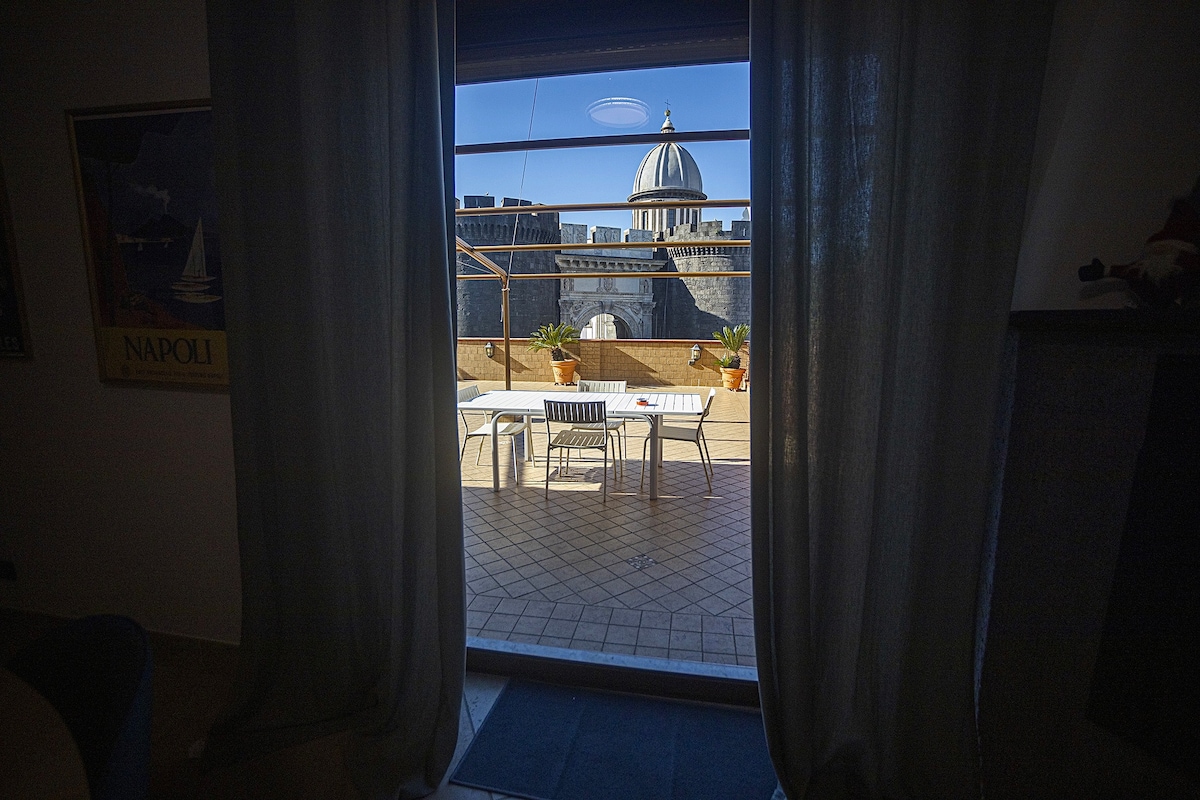 Un penthouse muy panorámico y romántico de unos 100 metros cuadrados, con una cocina equipada, 1 dormitorio, un living con un sofá cama grande que se puede adaptar como una tercera y cuarta cama, una chimenea y una terraza con una vista única de 360 grados de la ciudad de Nápoles, en el edificio histórico donde SOFIA LOREN y VITTORIO DE SICA filmaron los episodios de la famosa película El oro de Nápoles, con el metro Materdei, el Museo Arqueológico y la Piazza Bellini, la puerta de entrada al centro histórico de Nápoles, a solo 5 minutos.