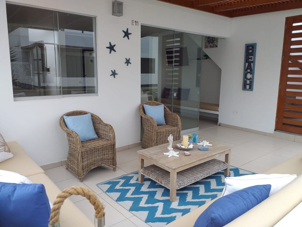Departamento de 190 metros cuadrados, segundo piso primer piso es el lobby, totalmente equipado y super seguro; El departamento está frente al mar con una bella vista.; también tiene a su disposición: Wifi y direct tv Jacuzzi con vista al mar Piscina para adultos y niños Cancha de tennis y frontón Zona de golf Cancha de fútbol 5v5 Area de parrilla y fogata Área de juegos para niños Restaurante y bar solo en temporada de verano. Sin sabanas, solo cubrecamas y almohadas.
