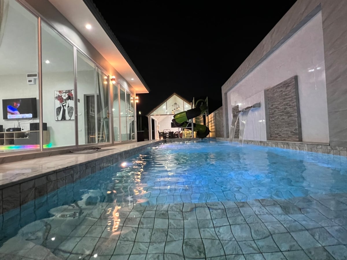 Villa Pool Hua Hin, recién inaugurada Ambiente privado, ideal para relajarse, decorado con un estilo moderno y sencillo. * Casa Pool Villa en un terreno de 90 m² * 3 dormitorios, 3 baños, cocina tailandesa, cocina europea, sala de estar. * Piscina de agua salada de 3x9 m y 1,5 m de profundidad * Tobogán en forma de S de 8 m de largo. * Smart TV de 75 pulgadas en la sala de estar * Equipo de karaoke + altavoz * Proyector de cine con pantalla de 120 pulgadas * Netflix gratis * Toallas + artículos de baño + secador de pelo * Barbacoa de barbacoa + cubitera * Aparatos eléctricos y utensilios de cocina completos