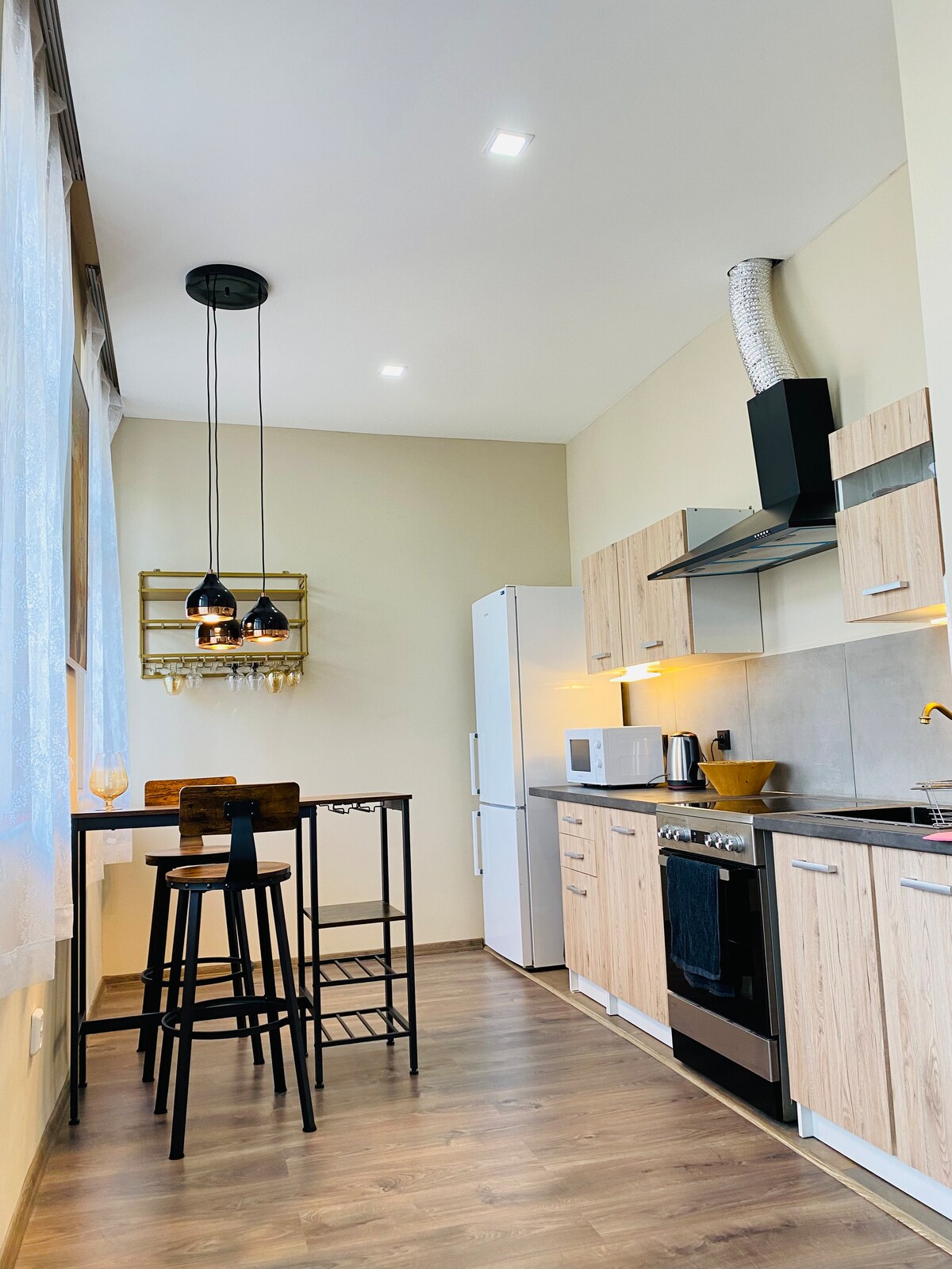 Está ubicado en el primer piso del restaurante. Hay 2 apartamentos con un número total de 5 camas (se puede ampliar a 10 personas) Ambos apartamentos están completamente renovados, equipados con muebles de madera elegantes. Tienen su propio baño, inodoro y cocina totalmente equipada. Cada departamento tiene una TV y una caja fuerte. Ambos apartamentos tienen una sala común. No se permite fumar en las habitaciones ni en la sala común.