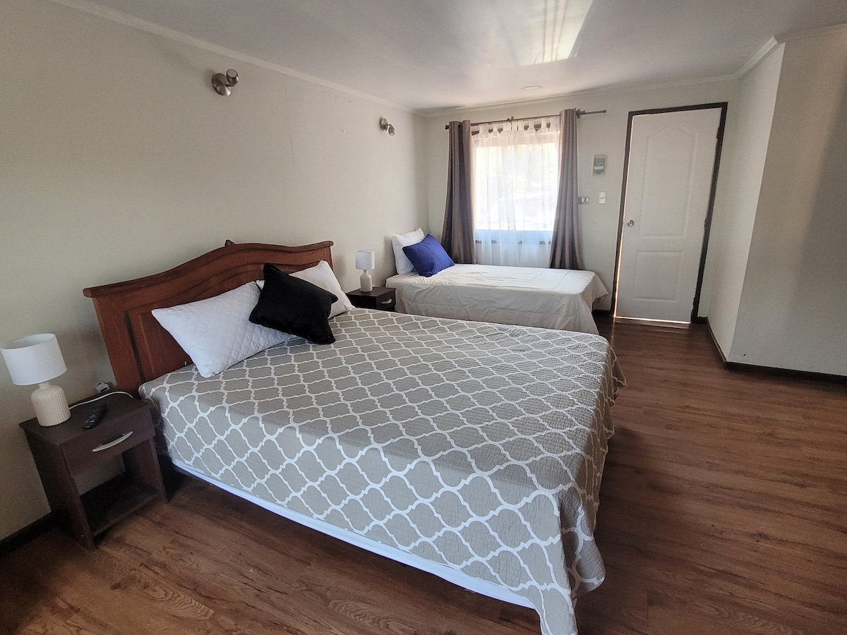 Departamento en Casa Familiar, Acceso Privado. 1 Amplio dormitorio con 1 cama matrimonial y una cama individual. Cocina bien equipada, living con smartTV. Y red WIFI de StarLink. Acceso a lavandería con secadora, y a gimnasio, ambos espacios son compartidos. Patio interior privado. El sector es muy tranquilo, con disponibilidad de locomoción, scooter y traslados. Para estadías largas opción de 3 camas individuales.