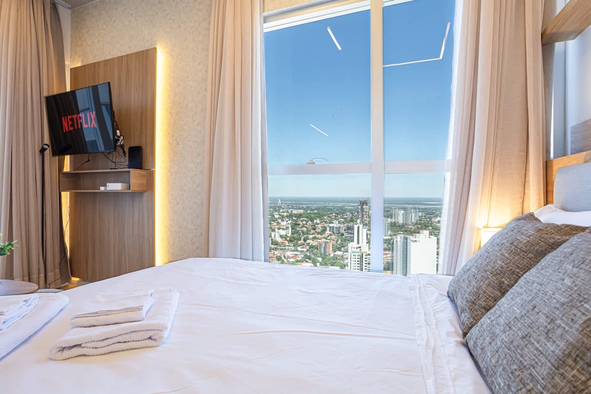 Stay in Paraguay’s tallest tower with full hotel-style comfort. This modern apartment offers stunning skyline views, premium furniture, high-speed WiFi, smart TV, and a fully equipped kitchen. Enjoy 24/7 security, fast elevators, and an unbeatable location near top restaurants, cafés, malls, and corporate centers.